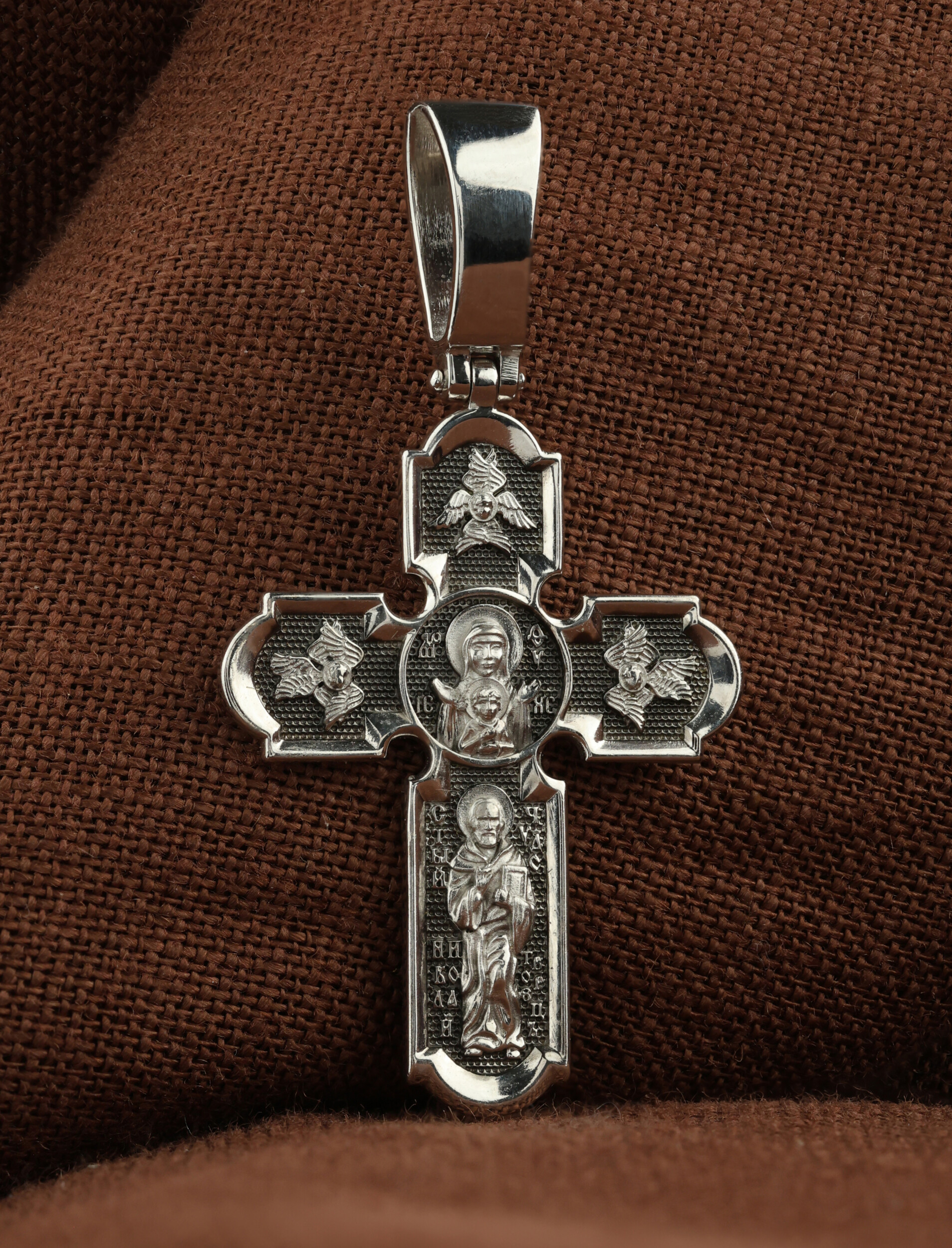 У основания креста в полный рост изображен самый любимый святой Православной Церкви — Николай Чудотворец. Святой почитается как целитель болезней, покровитель путешествующих, особенно по морю, помощник в торговле, учебе, а также в поисках достойного супруга.