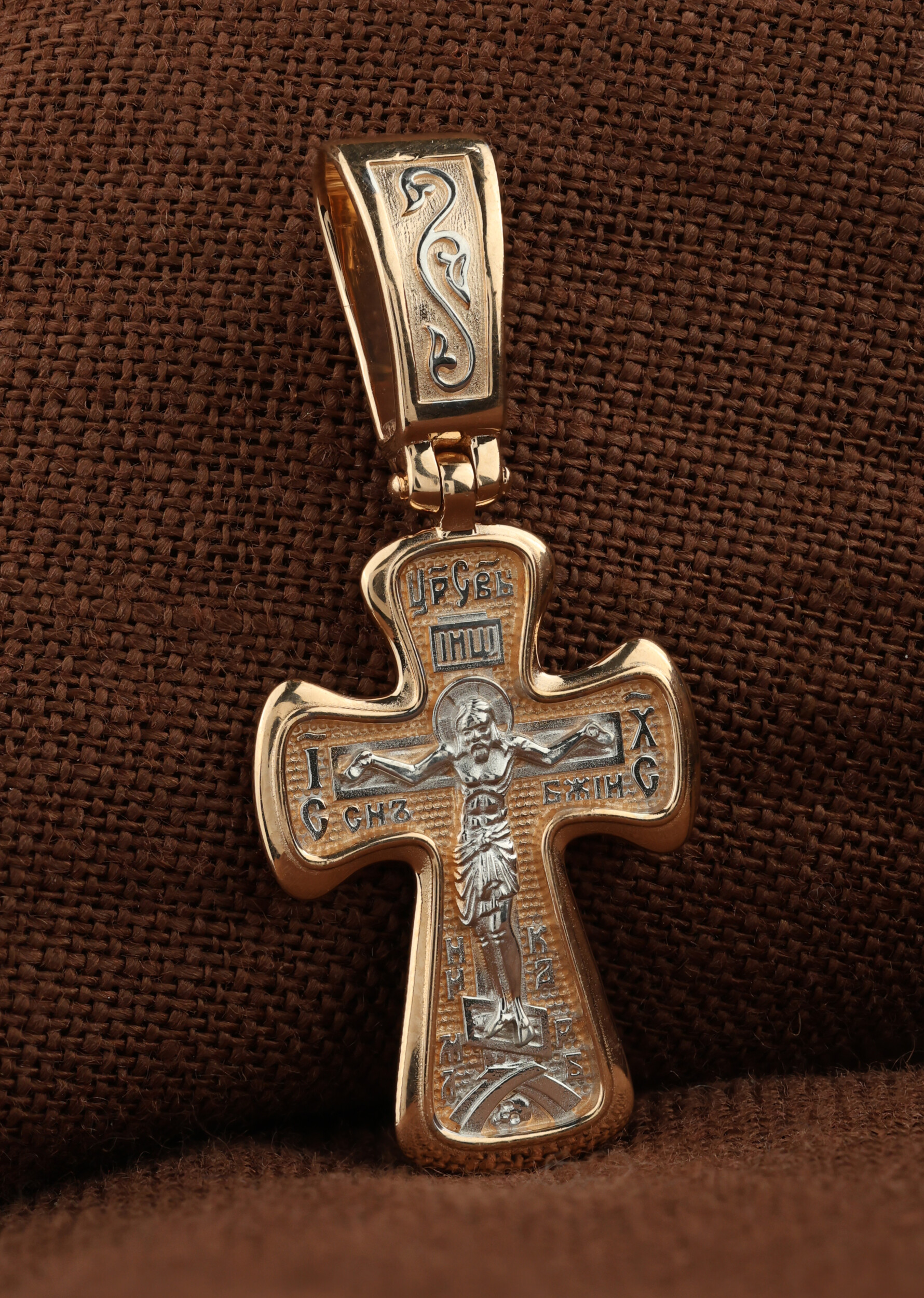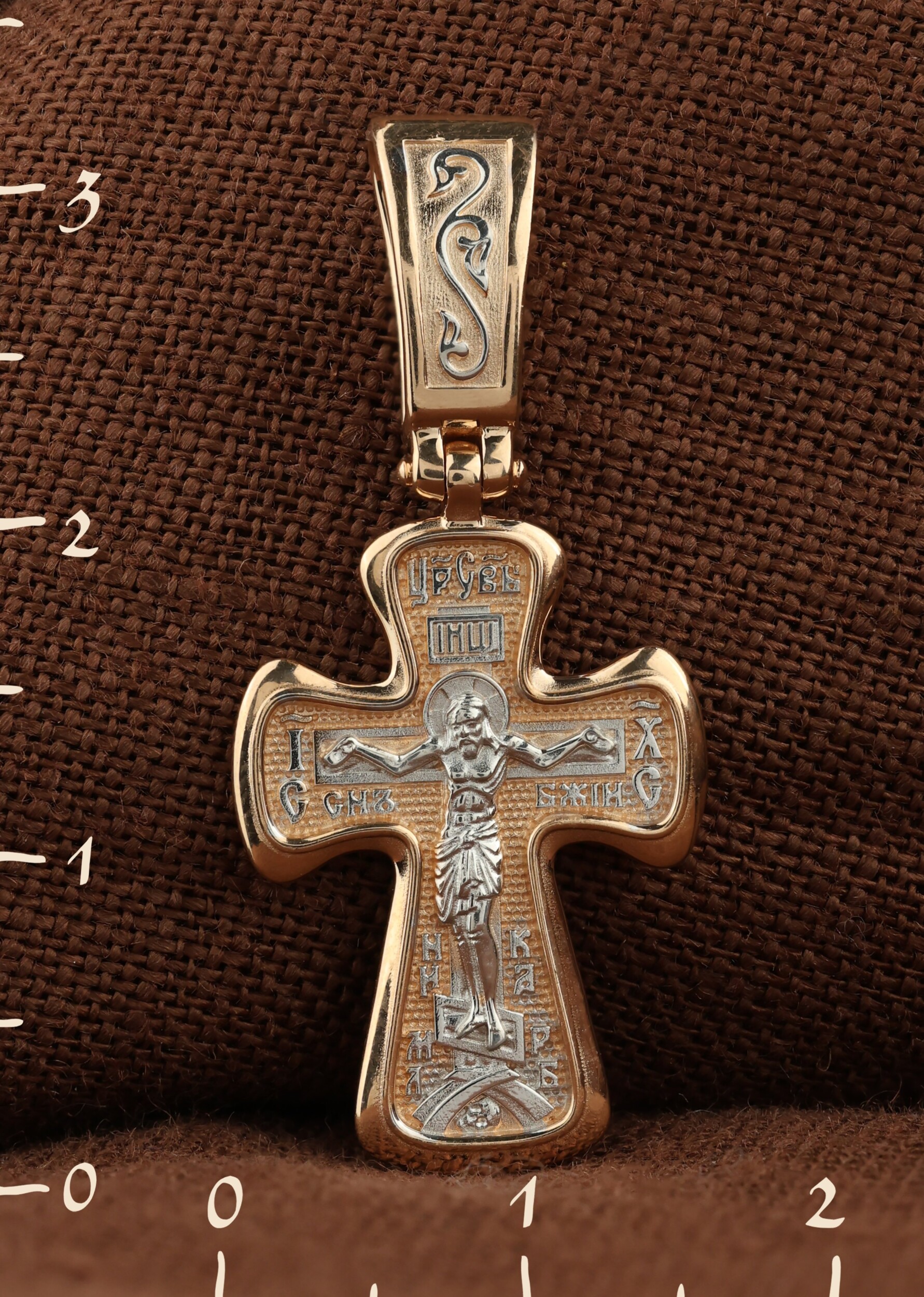На лицевой стороне креста изображено Распятие, потому что это орудие казни Иисус Христос сделал орудием победы над грехом и смертью. Своими страданиями Он искупил грехи человечества, умерев и сошествовав во ад, победил сатану, освободил души праведников от вечной смерти и открыл им небесные врата рая. Жертва Христа сделала возможным спасение для каждого человека. На православном кресте Христос не умирает, а свободно простирает руки, ладони Иисуса открыты, будто он хочет обнять все человечество, даря им свою любовь и открывая путь к вечной жизни. Над титлом видим слова «ЦРЬ СЛВЫ» — Царь Славы. Верхняя перекладина символизирует собой табличку с надписью «IHЦI» — Иисус Назарянин Царь Иудейский. Возле перекладины пишется сокращенно имя Спасителя «IC XC» — Иисус Христос, ниже перекладины добавляется: словосочетание «СНЪ БЖІЙ» — Сын Божий и «НИКА» (греч. — Победитель). Возвышение, на котором стоит Крест, символизирует гору Голгофу, на которой произошло Распятие. У подножия Креста изображают прах Адама, обозначенный черепом.