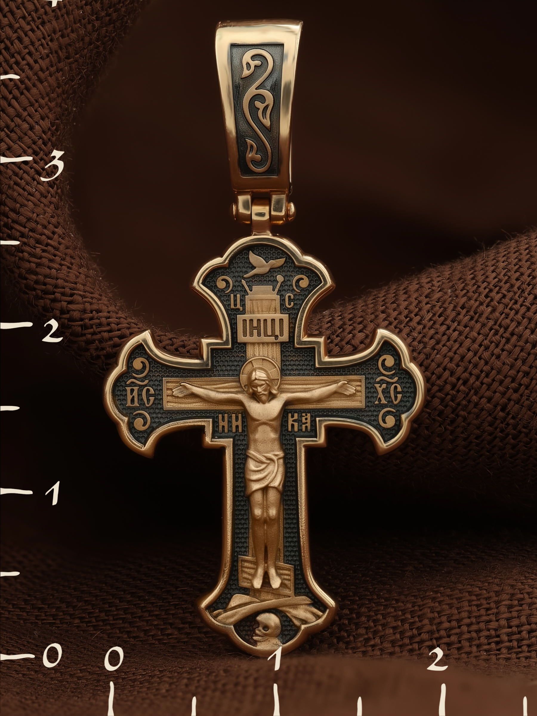 На лицевой стороне креста изображено Распятие, потому что это орудие казни Иисус Христос сделал орудием победы над грехом и смертью. Своими страданиями Он искупил грехи человечества, умерев и сошествовав во ад, победил сатану, освободил души праведников от вечной смерти и открыл им небесные врата рая. Жертва Христа сделала возможным спасение для каждого человека. На православном кресте Христос не умирает, а свободно простирает руки, ладони Иисуса открыты, будто он хочет обнять все человечество, даря им свою любовь и открывая путь к вечной жизни.