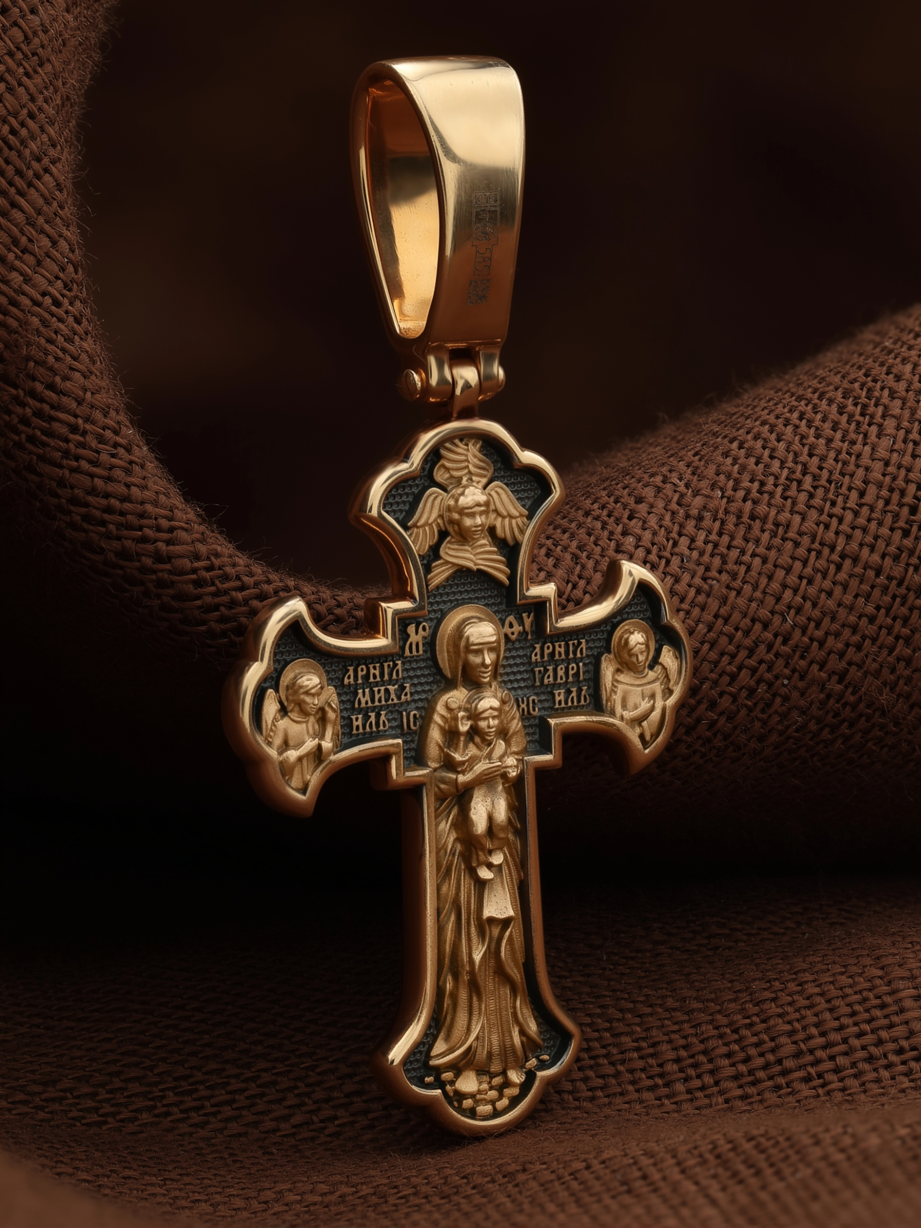 На обратной стороне креста в полный рост изображена Валаамская икона Божией Матери, над которой раскрыл свои крылья серафим. Этот образ написал в 1878 году иеромонах Валаамского монастыря о. Алипий. Валаамскую икону прославили многие чудеса, ее считают целительницей при разных недугах. Перед этим образом Богородицу молят в первую очередь об укреплении веры, просят даровать смирение, твердость в соблюдении заповедей Христовых и об исцелении. Богородице предстоят два архангела, Михаил и Гавриил.
