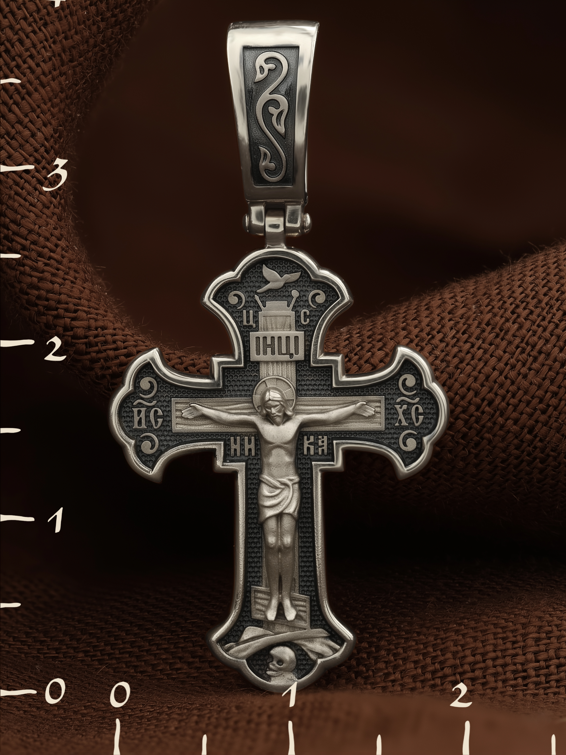 На лицевой стороне креста изображено Распятие, потому что это орудие казни Иисус Христос сделал орудием победы над грехом и смертью. Своими страданиями Он искупил грехи человечества, умерев и сошествовав во ад, победил сатану, освободил души праведников от вечной смерти и открыл им небесные врата рая. Жертва Христа сделала возможным спасение для каждого человека. На православном кресте Христос не умирает, а свободно простирает руки, ладони Иисуса открыты, будто он хочет обнять все человечество, даря им свою любовь и открывая путь к вечной жизни.