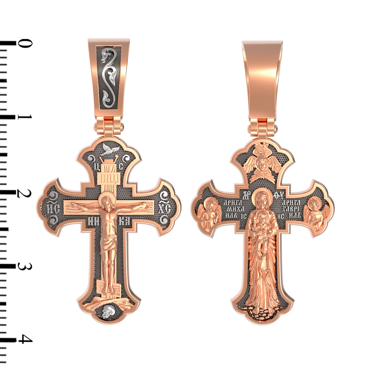 На обратной стороне креста в полный рост изображена Валаамская икона Божией Матери, над которой раскрыл свои крылья серафим. Этот образ написал в 1878 году иеромонах Валаамского монастыря о. Алипий. Валаамскую икону прославили многие чудеса, ее считают целительницей при разных недугах. Перед этим образом Богородицу молят в первую очередь об укреплении веры, просят даровать смирение, твердость в соблюдении заповедей Христовых и об исцелении. Богородице предстоят два архангела, Михаил и Гавриил.