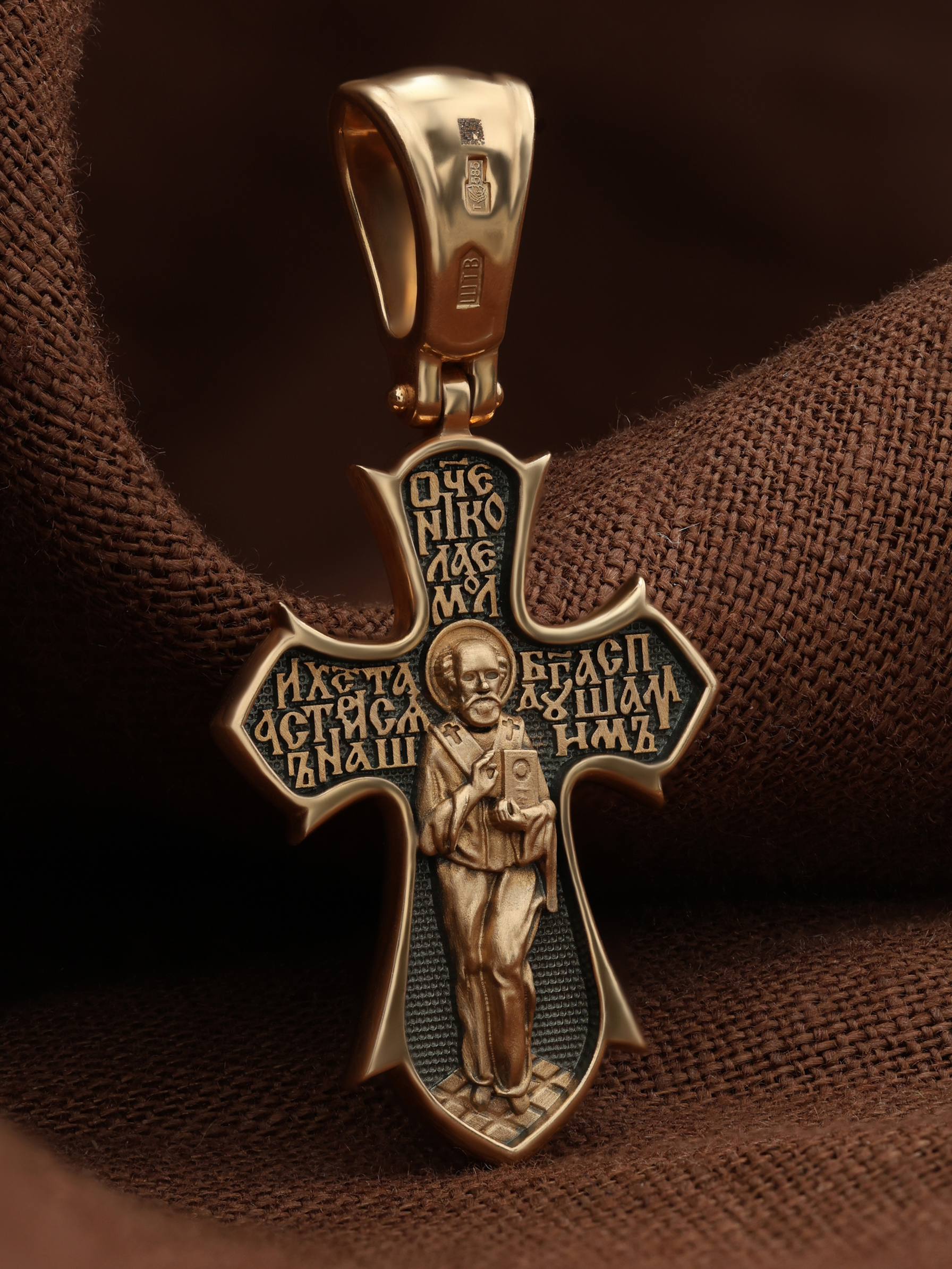 Оборотную сторону креста возглавляет икона Святителя Николая Чудотворца, которого еще называют Николай Угодник за то, что он угодил своей жизнью Богу. Николай Чудотворец, помощник в делах, покровитель учащихся, утешитель обиженных. Также Святитель Николай Чудотворец известен своими молитвами за путешественников, когда непрестанный ветер и бушующие волны утихают и корабль заходит в спокойную гавань. На кресте написана молитва: «Отче Николае, моли Христа Бога спастися душам нашим».