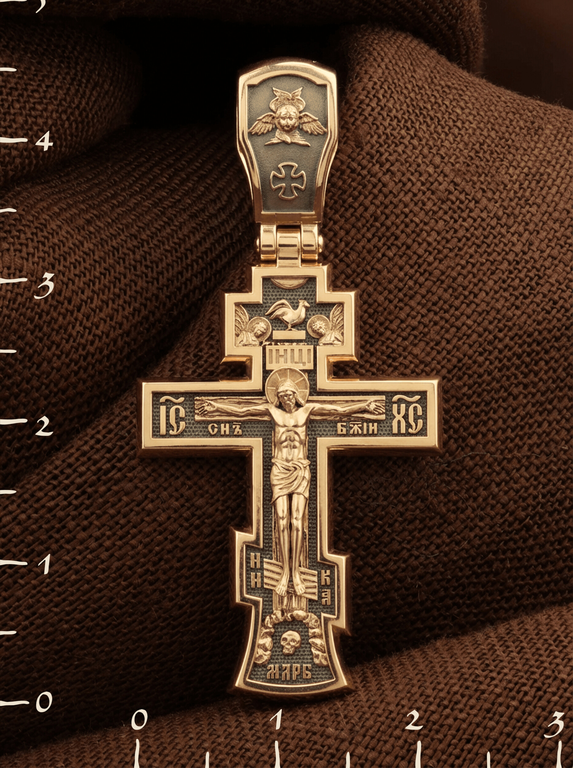 На лицевой стороне этого креста центральную часть занимает икона Распятия Христа — образ жертвы, принесенной Господом за грехи людей. Именно ко Христу, сошедшему на землю ради нашего спасения, возносятся все молитвы. Рядом с Его образом помещены слова — «НИКА» и «Сын Божий». Эти слова характеризуют Господа как Великого Архиерея, победителя смерти. Также Распятие сопровождается надписями, олицетворяющими Христа — это святое имя Христа «IC» (Иисус) «ХС» (Христос). На кулонном кольце написано «Царь Славы».