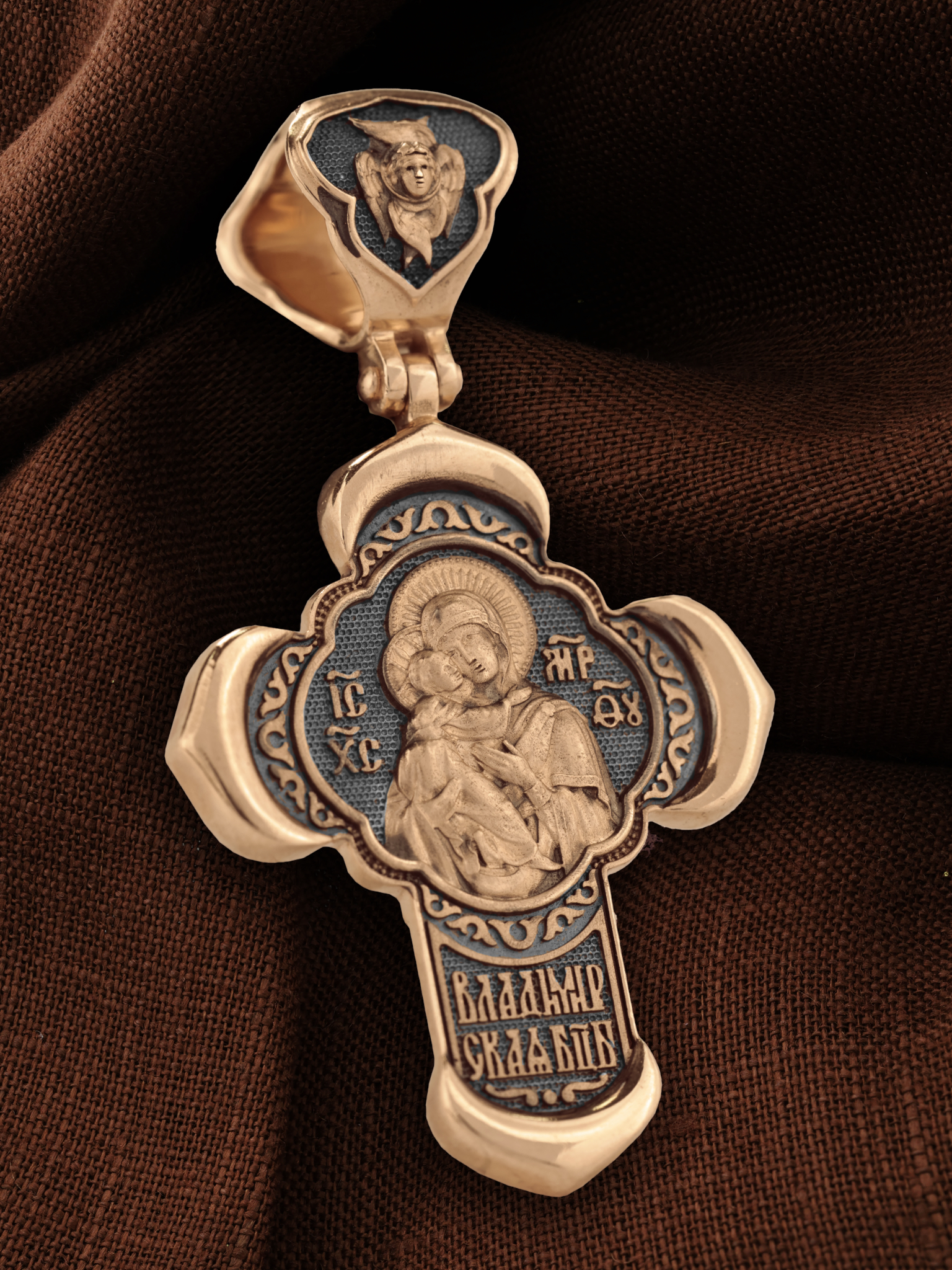 В центре оборотной стороне креста помещен образ Владимирской иконы Божией Матери — один из самых чтимых святынь Русской православной церкви. По преданию, икона была написана Святым апостолом и евангелистом Лукой во время земной жизни Богородицы. Икона Владимирской Божией Матери вплоть до V века находилась в Иерусалиме, затем была перевезена в Византию. На Русь икона была привезена в 1131 г. За прошедшие столетия святыня неоднократно переезжала из Владимира в Москву и обратно, не раз спасая страну от захватчиков. Русская Православная Церковь установила троекратное празднование Владимирской иконе Божией Матери. Каждый из дней празднования связан с избавлением русского народа от порабощения иноплеменниками по молитвам ко Пресвятой Богородице