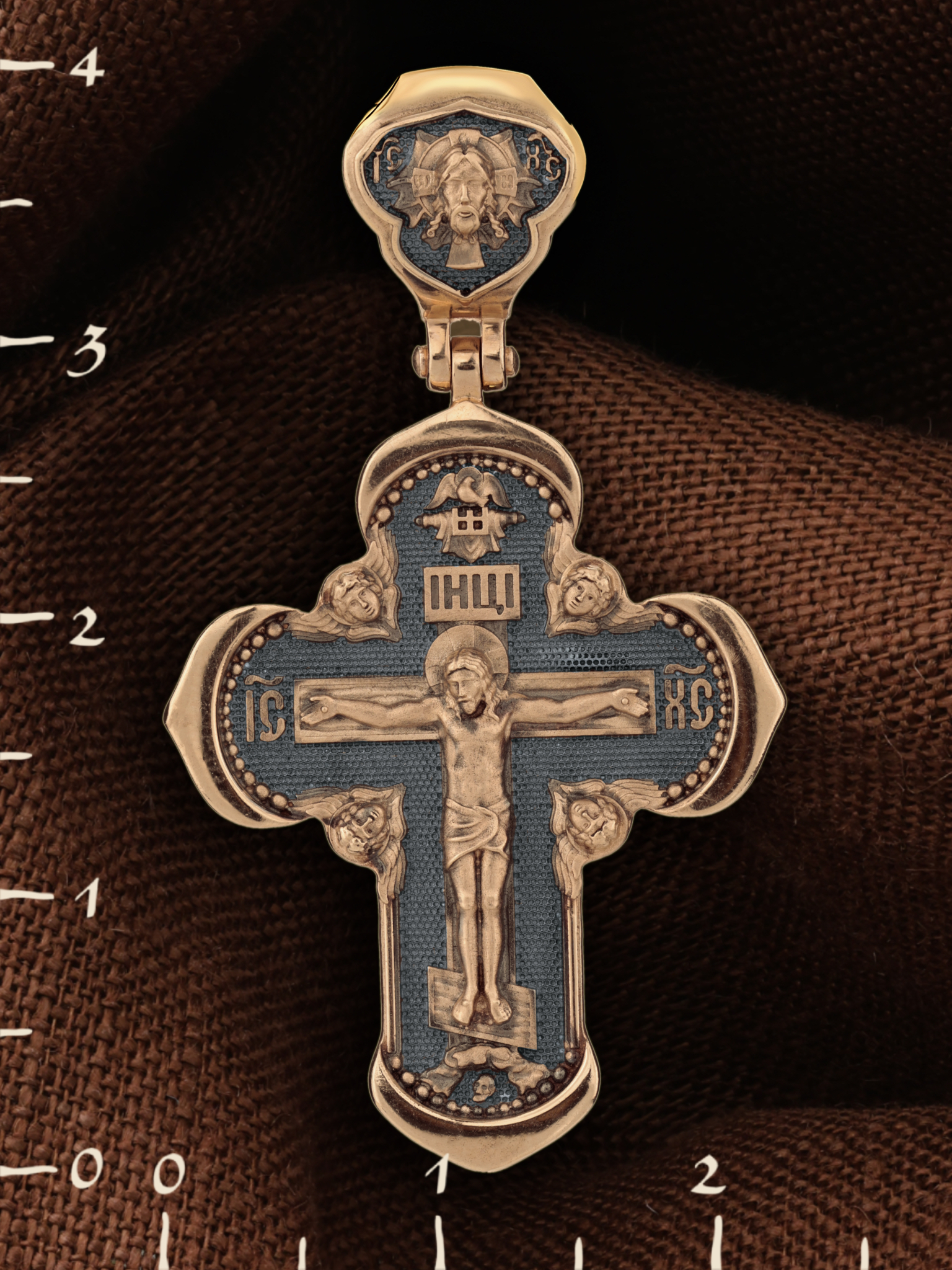 На лицевой стороне креста изображено Распятие Господа и Спасителя нашего Иисуса Христа, отдавшего Себя на смерть, для искупления грехов мира. Крест является символом жертвенной любви Всеблагого Бога к падшим людям, всепобеждающим духовным оружием христиан, основанием и средоточием церковной жизни. Господь сказал: «кто хочет идти за Мною, отвергнись себя, и возьми крест свой, и следуй за Мною». (Мк. 8: 34). На верхней табличке, выше головы Иисуса, расположена надпись, составленная Понтием Пилатом — «IНЦI». Она означает «Иисус Назорей, Царь Иудейский». Надпись «IC» «ХC», означает Иисус Христос, помещается на разных сторонах поперечной перекладины креста. Крест стоит на горе камней, символизирующих Голгофу. В ее основании различается череп– это голова Адама. На кулонном кольце изображен Нерукотворный образ Господа и Спасителя нашего Иисуса Христа, чудесно отпечатавшийся на плате, которым Христос вытер свой лик.