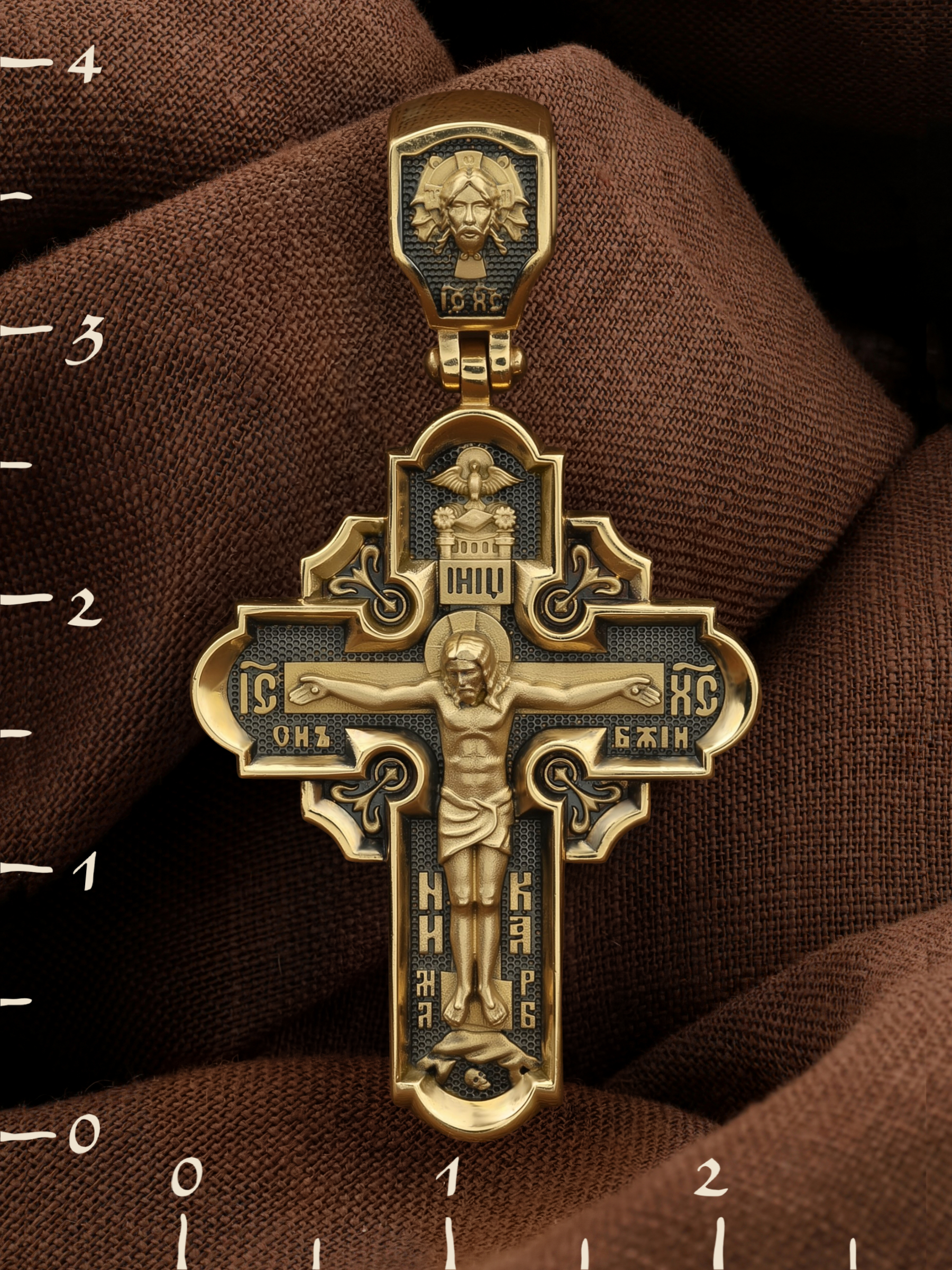 На лицевой стороне креста изображено Распятие Господа и Спасителя нашего Иисуса Христа, отдавшего Себя на смерть, чтобы другие могли жить — жить вечной жизнью, жить с Богом. Своею кровью Господь освятил крест и сделал его проводником Своей благодати, источником освящения верующих. На верхней табличке, выше головы Иисуса, расположена надпись, составленная Понтием Пилатом — «ИНЦИ». Она означает «Иисус Назорей, Царь Иудейский». Надпись «IС ХС» означает Иисус Христос помещается на разных сторонах поперечной (большой) перекладины креста. На кулонном кольце помещено изображение Духа Святого в виде голубя, сходящего с Небес