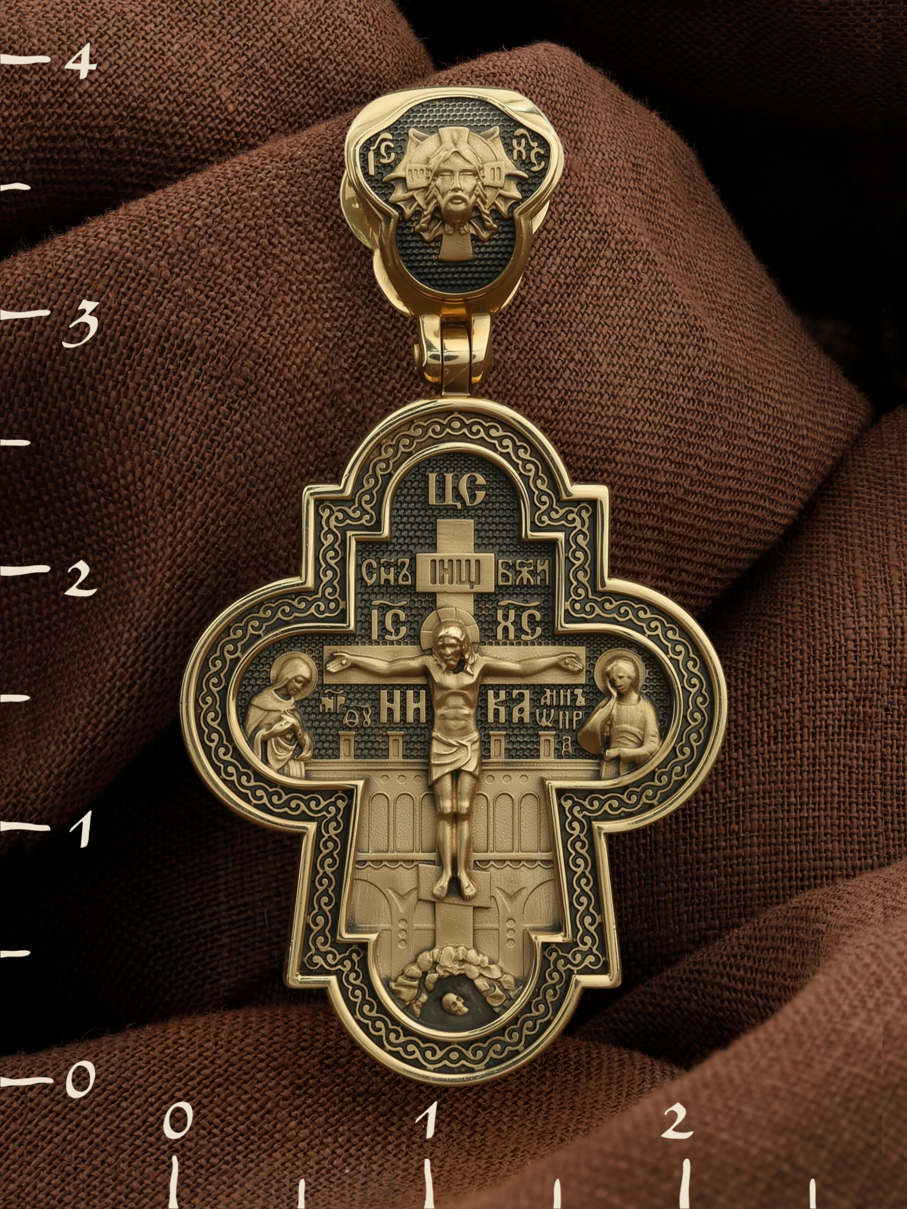 На лицевой стороне креста изображено Распятие Господа и Спасителя нашего Иисуса Христа, отдавшего Себя на смерть, чтобы другие могли жить — жить вечной жизнью, жить с Богом. Через крестную жертву Бог раскрывает нам Свою безмерную любовь и призывает к ответной любви. Своею кровью Господь освятил крест и сделал его проводником Своей благодати, источником освящения верующих. На верхней табличке, выше головы Иисуса, расположена надпись, составленная Понтием Пилатом — «IНЦI». Она означает «Иисус Назорей, Царь Иудейский». Распятие сопровождается каноническими надписями. Над Распятием находится надпись «Царь Славы». Надпись «IС» « ХС» означает Иисус Христос и помещается на разных сторонах поперечной (большой) перекладины креста. Рядом расположены надпись «Сын Божий» и слово «НИКА», что означает «победитель». Слева от Распятия изображена Пресвятая Богородица, справа — апостол и евангелист Иоанн Богослов, один из ближайших учеников Иисуса Христа. За Распятием высится Иерусалимская стена, в знак того, что Господь был распят вне стен города. Возвышение, на котором стоит Крест, символизирует гору Голгофу, на которой произошло Распятие. Под подножием Креста изображена покоящаяся голова (череп) Адама. Над На кулонном кольце изображен Нерукотворный образ Господа и Спасителя нашего Иисуса Христа, чудесно отпечатавшийся на плате, котором Христос вытер свой лик.