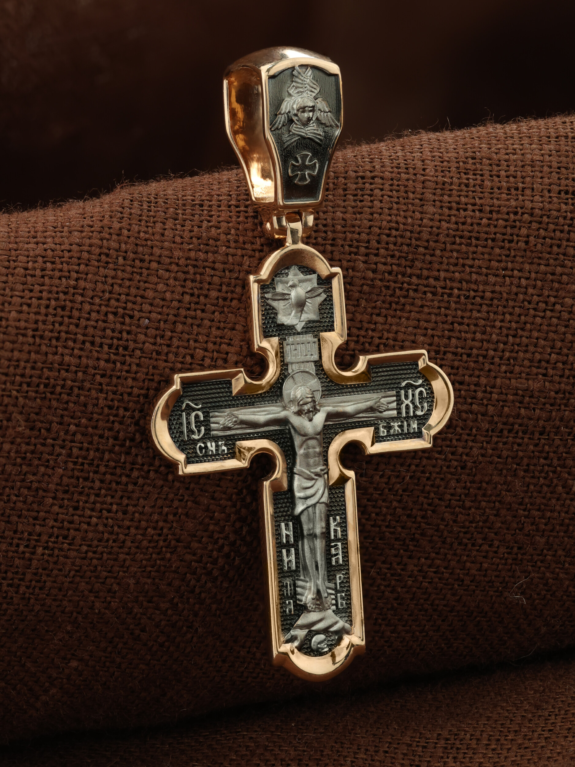 На лицевой стороне креста изображено Распятие Иисуса Христа. Господь представлен свободно покоящимся на кресте с простертыми руками и как бы обнимающим всю Вселенную. Верхняя перекладина символизирует титло — табличку, на которой, согласно Евангелию, было начертано: Иисус Назорей Царь Иудейский (IНЦI). Также Распятие сопровождается надписями, олицетворяющими Христа: святое имя Христа «IC» (Иисус) «ХС» (Христос), и словосочетание «СНЪ БЖIЙ» — СЫН БОЖИЙ. Рядом с образом Христа помещены слова — «НИКА» (греч. — Победитель) и четыре буквы «МЛ» «РБ» — Место Лобное Рай Бысть. Возвышение, на котором стоит Крест, символизирует гору Голгофу, на которой произошло Распятие. У подножия Креста изображают прах Адама, обозначенный черепом. На кулонном кольце изображен шестикрылый Серафим — самый приближенный к Господу Ангел.