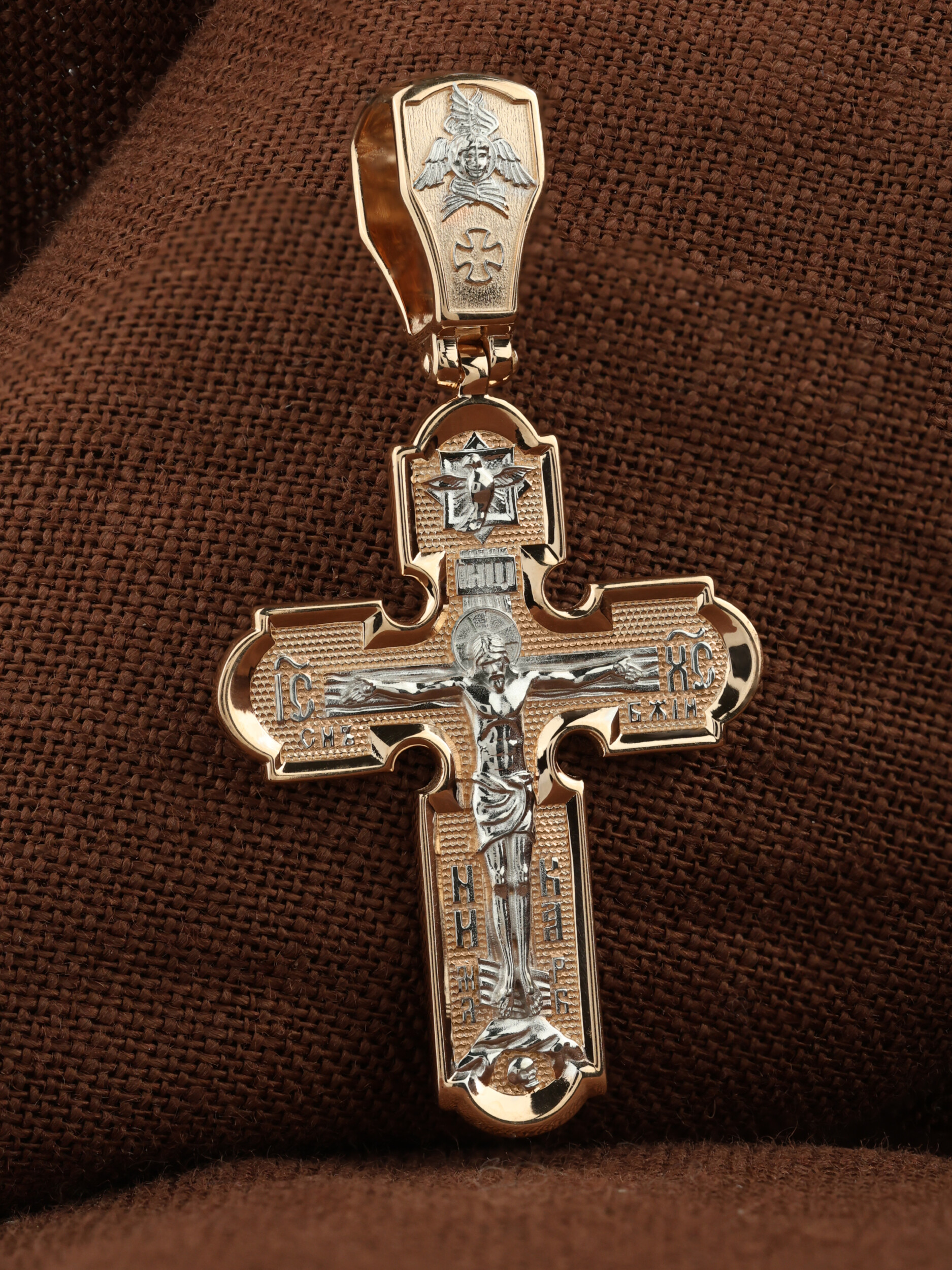 На лицевой стороне креста изображено Распятие Иисуса Христа. Господь представлен свободно покоящимся на кресте с простертыми руками и как бы обнимающим всю Вселенную. Верхняя перекладина символизирует титло — табличку, на которой, согласно Евангелию, было начертано: Иисус Назорей Царь Иудейский (IНЦI). Также Распятие сопровождается надписями, олицетворяющими Христа: святое имя Христа «IC» (Иисус) «ХС» (Христос), и словосочетание «СНЪ БЖIЙ» — СЫН БОЖИЙ. Рядом с образом Христа помещены слова — «НИКА» (греч. — Победитель) и четыре буквы «МЛ» «РБ» — Место Лобное Рай Бысть. Возвышение, на котором стоит Крест, символизирует гору Голгофу, на которой произошло Распятие. У подножия Креста изображают прах Адама, обозначенный черепом. На кулонном кольце изображен шестикрылый Серафим — самый приближенный к Господу Ангел.