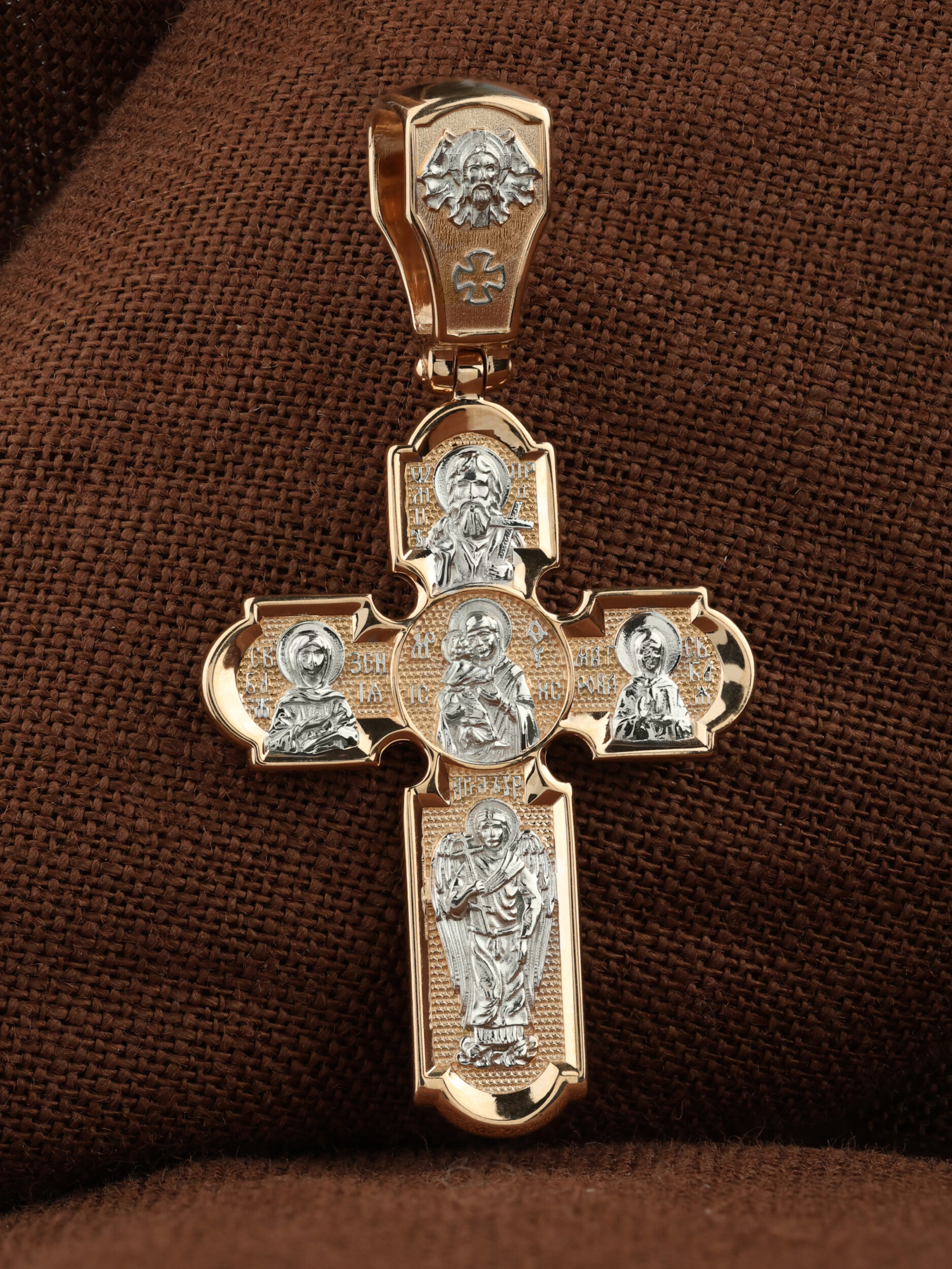Центральную часть оборота креста украшает Владимирская икона Божией Матери. По преданию, она была написана на доске трапезного стола из дома Иисуса Христа. На Русь икона была привезена в начале XII века и с тех пор почитается как главная святыня нашего Отечества. Внизу изображен Архангел Михаил, слева — Святая Блаженная Ксения, справа — Святая Блаженная Матрона, вверху — пророк, почитающийся в христианстве, Предтеча Господень Иоанн Креститель. На кулонном кольце изображен Спас Нерукотворный — Символ вочеловечившегося Божества.