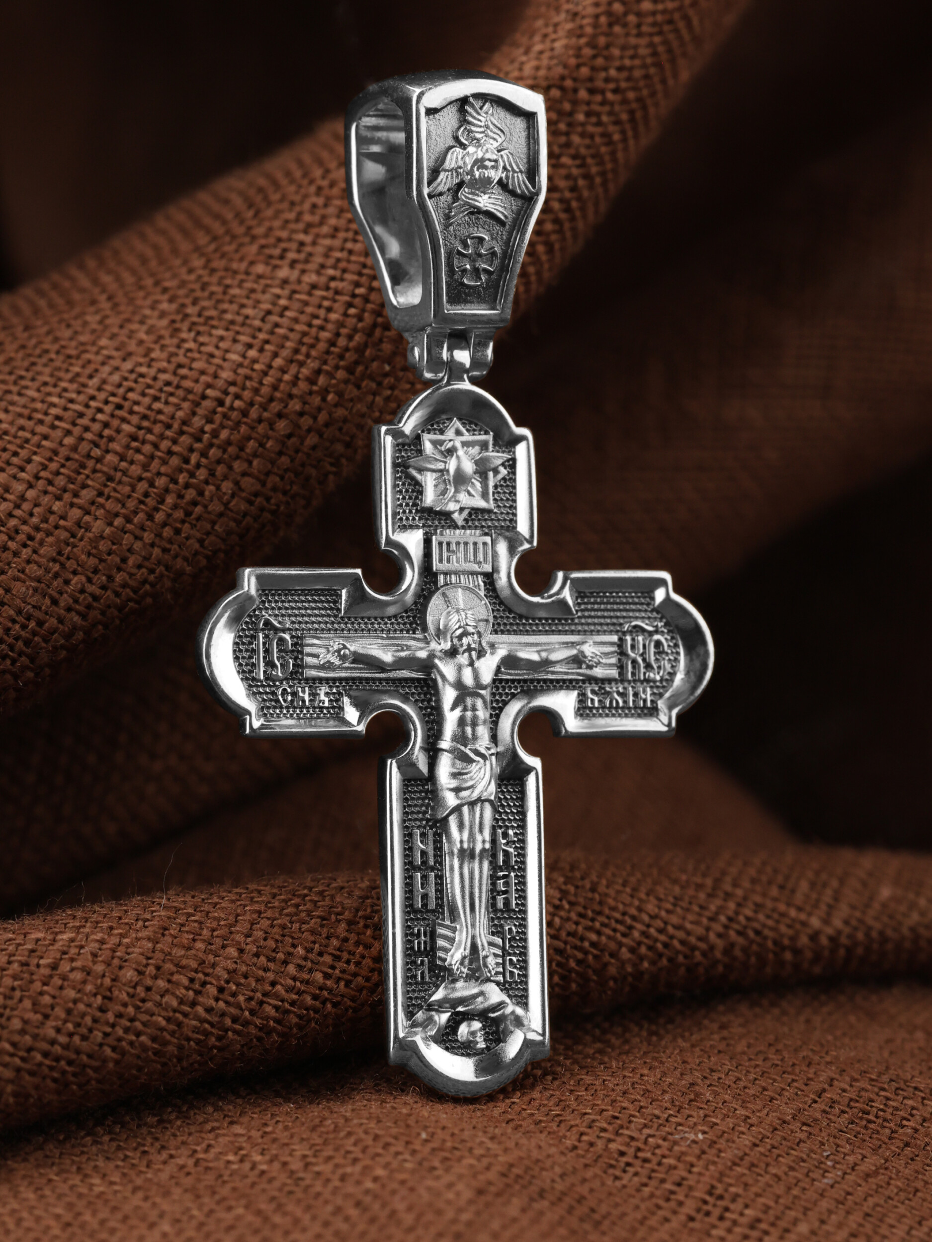 На лицевой стороне креста изображено Распятие Иисуса Христа. Господь представлен свободно покоящимся на кресте с простертыми руками и как бы обнимающим всю Вселенную. Верхняя перекладина символизирует титло — табличку, на которой, согласно Евангелию, было начертано: Иисус Назорей Царь Иудейский (IНЦI). Также Распятие сопровождается надписями, олицетворяющими Христа: святое имя Христа «IC» (Иисус) «ХС» (Христос), и словосочетание «СНЪ БЖIЙ» — СЫН БОЖИЙ. Рядом с образом Христа помещены слова — «НИКА» (греч. — Победитель) и четыре буквы «МЛ» «РБ» — Место Лобное Рай Бысть. Возвышение, на котором стоит Крест, символизирует гору Голгофу, на которой произошло Распятие. У подножия Креста изображают прах Адама, обозначенный черепом. На кулонном кольце изображен шестикрылый Серафим — самый приближенный к Господу Ангел.