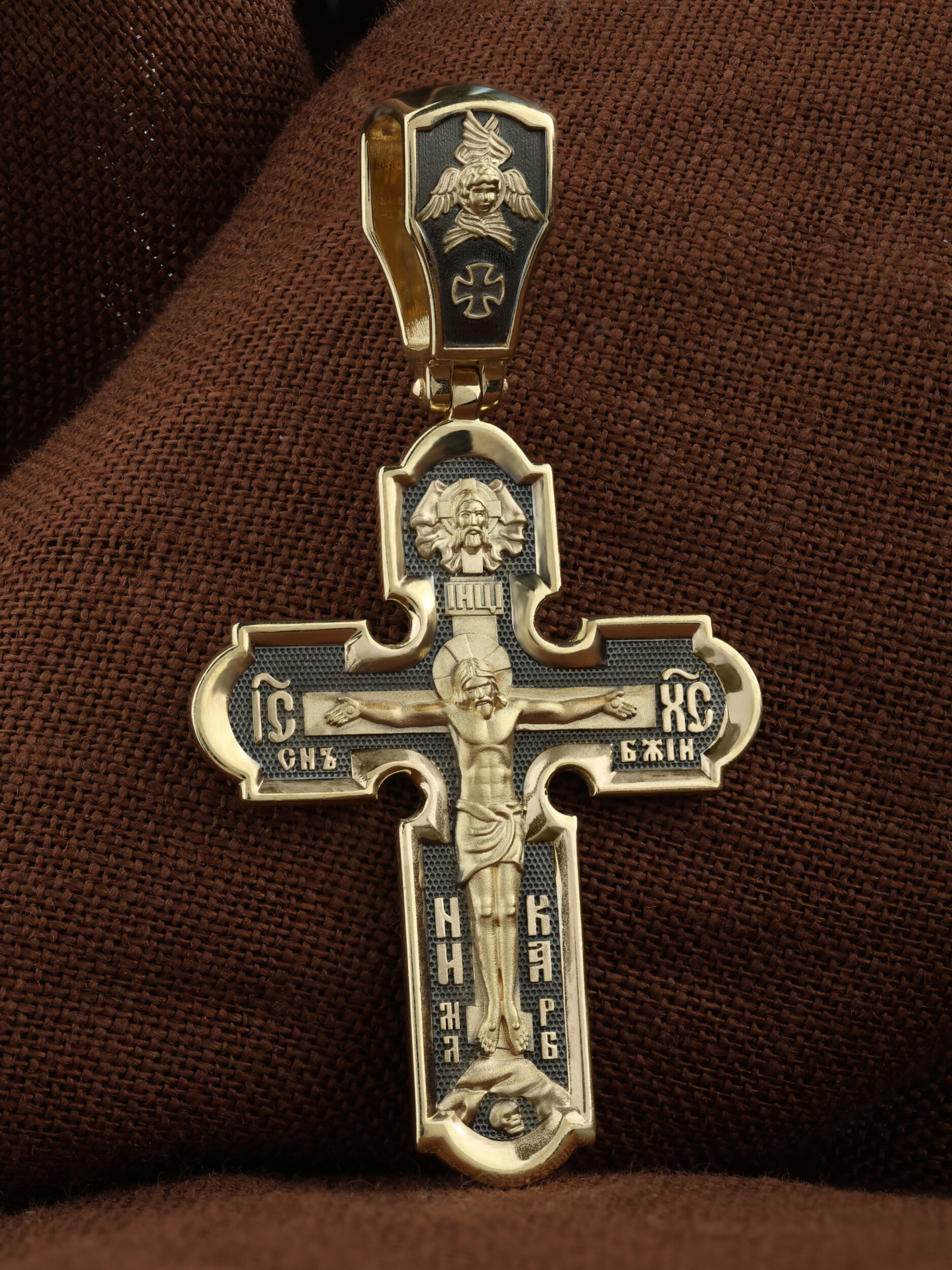На лицевой стороне нательного креста по традиции изображено Распятие Господа нашего Иисуса Христа. Крест Господень стоит на небольшом каменистом возвышении, символизирующем гору Голгофу, которая обозначена буквами МЛРБ (Место Лобное Рай Бысть). Над головой Господа на поперечной перекладине написано «ИНЦИ», что символизирует табличку, которая была прибита к Кресту, с надписью «Иисус Назорей Царь Иудейский». Этим иудеи хотели посмеяться над Христом, не зная, что распинают истинного Царя всех царей. По сторонам основной перекладины расположены позолоченные рельефные инициалы Христа «ИС ХС». Под перекладиной, по сторонам древа, находится надпись «СЫН БОЖИЙ», а в основании креста — надпись «НИКА» (Победитель).