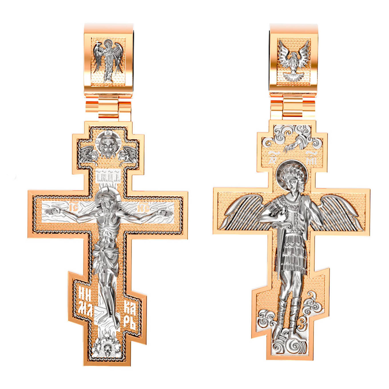 На оборотной стороне креста помещен Архангел Михаил, самый могущественный из ангелов. Это он низверг дьявола и встал во главе ангелов для борьбы с бесовскими силами. Его имя означает «Кто яко Бог?», так как он самый могучий и грозный враг зла. Древнерусские князья и воины стремились обрести покровительство Небесного Воеводы и нередко украшали свои шлемы его крылатой фигурой. На Руси также верили, что Архангел Михаил, как непримиримый враг дьявола, защищает и души умерших от бесовских нападений, провожая их на Небеса. Поэтому ему часто посвящались кладбищенские церкви.