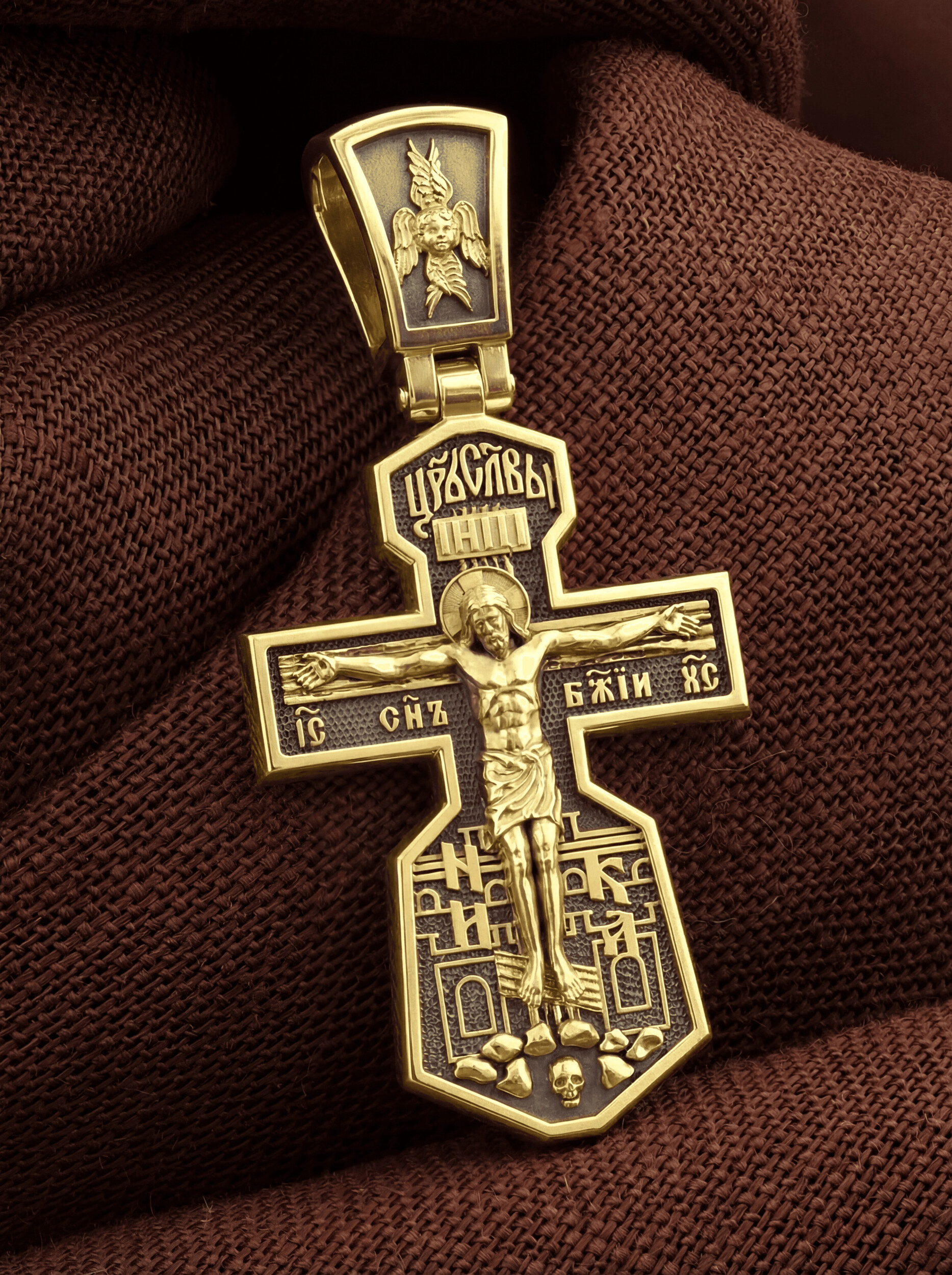 На лицевой стороне креста изображено Распятие Иисуса Христа. Господь представлен свободно покоящимся на кресте с простертыми руками и как бы обнимающим всю Вселенную. Он — Спаситель, искупивший грехи мира, «поправший смертию смерть» и призывающий к Себе «все концы земли». Поэтому рядом с Его образом помещены слова — «НИКА» и «Царь Славы». Эти слова характеризуют Господа как Великого Архиерея, победителя смерти. Верхняя перекладина символизирует титло — табличку, на которой, согласно Евангелию, было начертано: Иисус Назорей Царь Иудейский (IНЦI). Также Распятие сопровождается надписями, олицетворяющими Христа. Это святое имя Христа «IC» (Иисус) «ХС» (Христос), и словосочетание «СЫН БОЖИЙ».