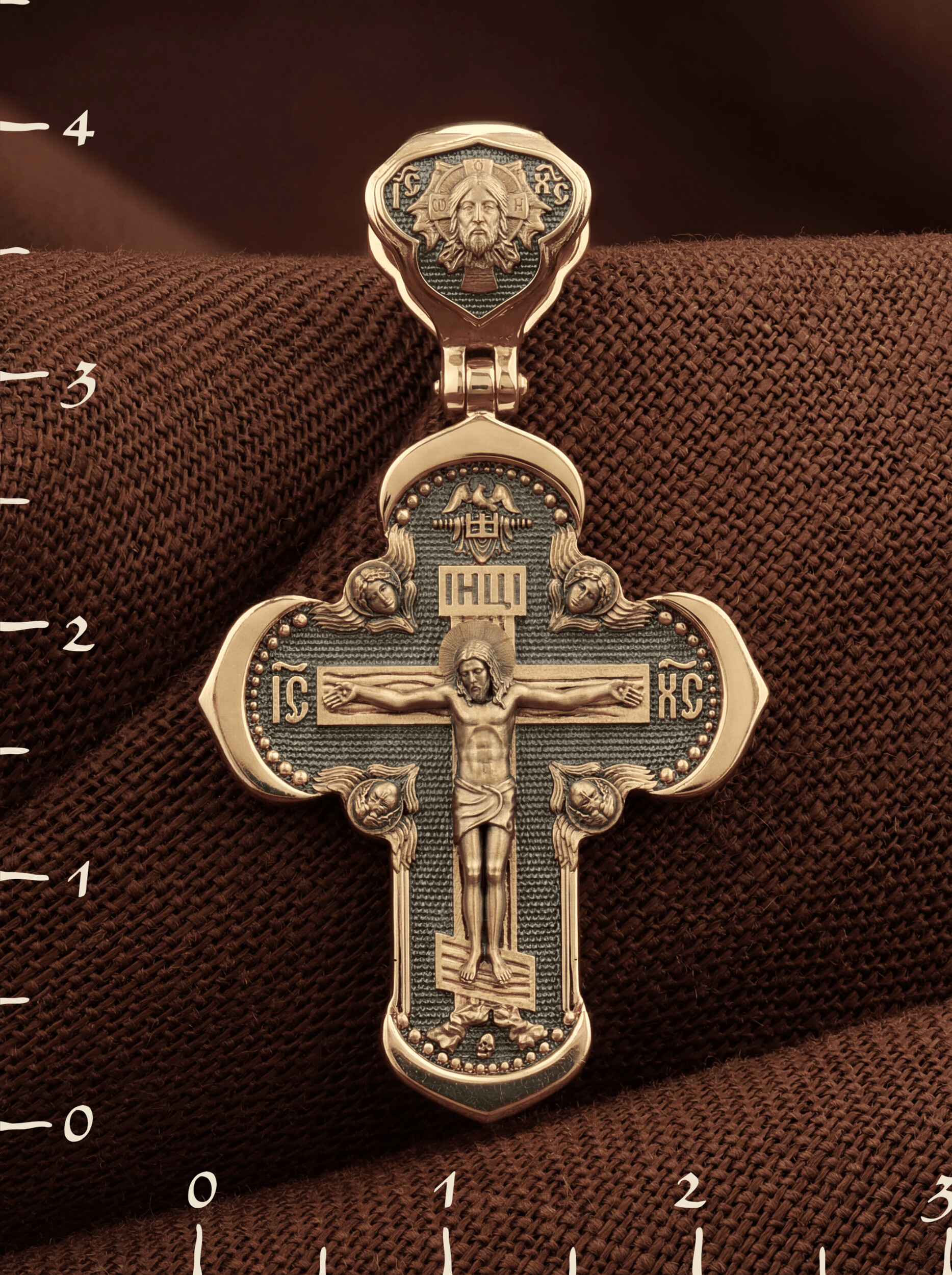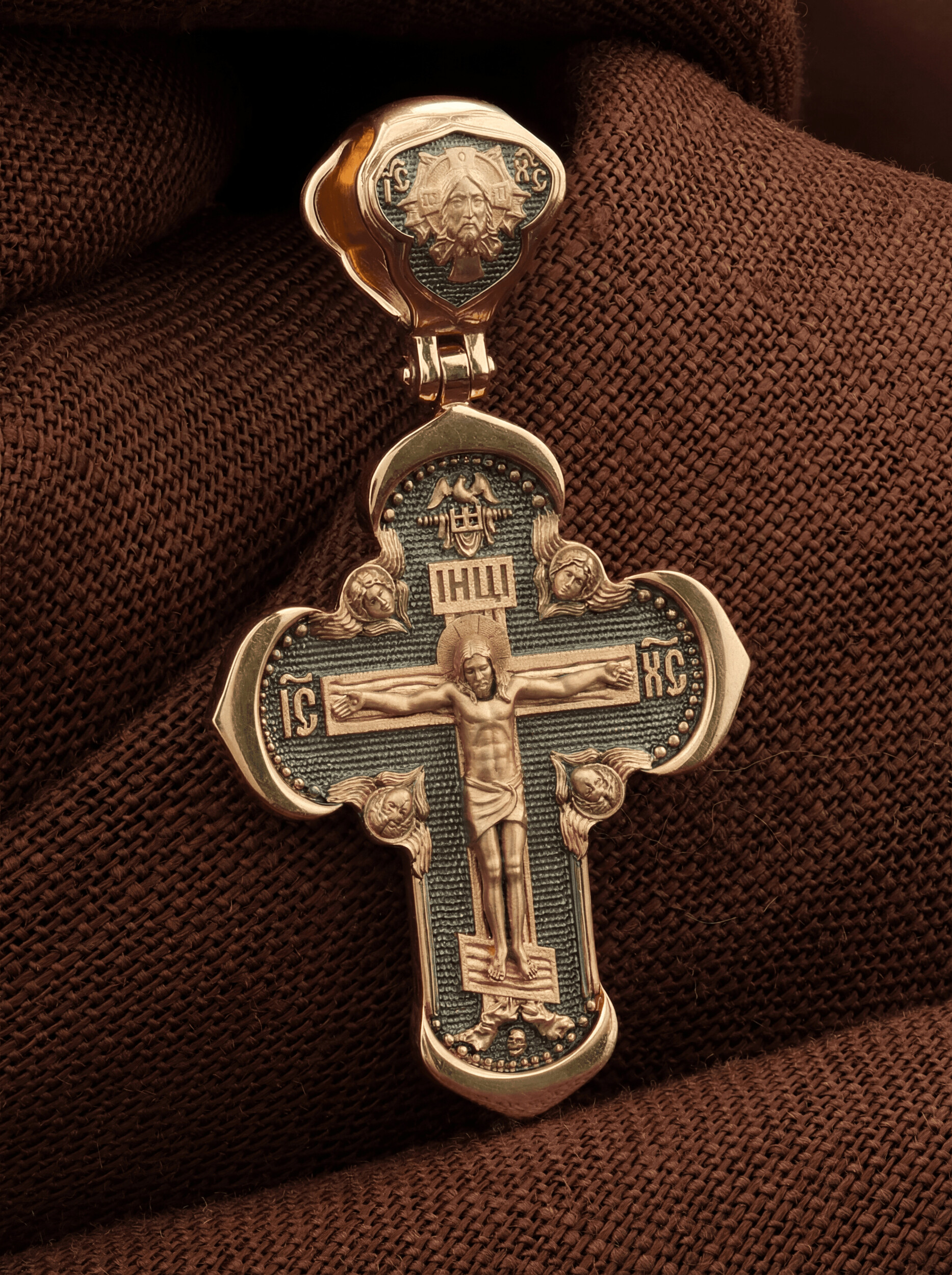 На лицевой стороне креста изображено Распятие Господа и Спасителя нашего Иисуса Христа, отдавшего Себя на смерть, для искупления грехов мира. Крест является символом жертвенной любви Всеблагого Бога к падшим людям, всепобеждающим духовным оружием христиан, основанием и средоточием церковной жизни. Господь сказал: «кто хочет идти за Мною, отвергнись себя, и возьми крест свой, и следуй за Мною». (Мк. 8: 34). На верхней табличке, выше головы Иисуса, расположена надпись, составленная Понтием Пилатом — «IНЦI». Она означает «Иисус Назорей, Царь Иудейский». Надпись «IC» «ХC», означает Иисус Христос, помещается на разных сторонах поперечной перекладины креста. Крест стоит на горе камней, символизирующих Голгофу. В ее основании различается череп– это голова Адама. На кулонном кольце изображен Нерукотворный образ Господа и Спасителя нашего Иисуса Христа, чудесно отпечатавшийся на плате, которым Христос вытер свой лик.