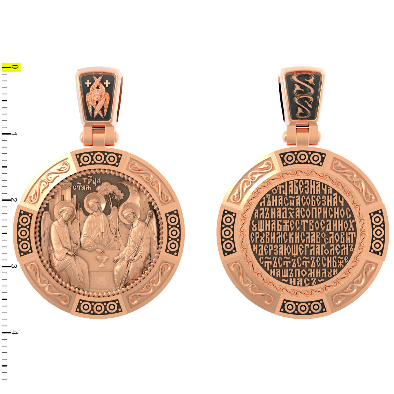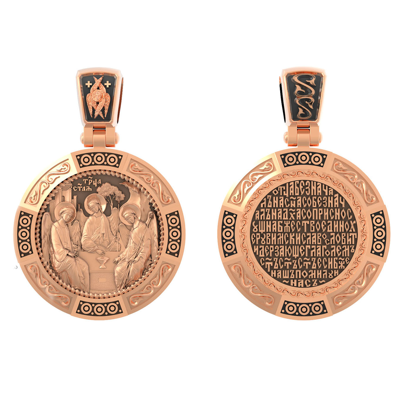 На лицевой стороне изображена икона Святой Троицы. Это образ Триединого Бога явившегося в виде трех Ангелов праотцу Аврааму. Ангелы сидят за трапезным столом вокруг чаши, которая символизирует грядущую жертву Второго Лица Пресвятой Троицы, Бога Сына.