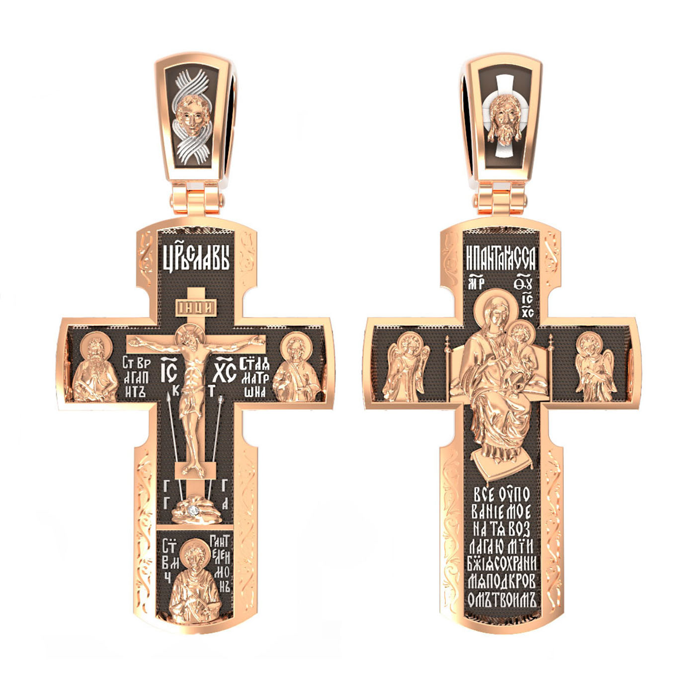 Как действенная помощь в немощах и болезнях был создан крест с образами святых целителей и со знаменитой афонской иконой Божией Матери «Всецарица». Над титлом видим слова «ЦРЬ СЛВЫ» — Царь Славы. Верхняя перекладина символизирует собой табличку с надписью «IHЦI» — Иисус Назарянин Царь Иудейский. Под перекладиной пишется сокращенно имя Спасителя «IC XC» — Иисус Христос. Возвышение, на котором стоит Крест, символизирует гору Голгофу, на которой произошло Распятие. У подножия Креста изображают прах Адама, обозначенный черепом. Справа от Распятия помещен образ прославленной святой блаженной Матроны. Слева — икона преподобный Агапита. Этот святой жил в пещерах Киево-Печерского монастыря в XI веке и бескорыстно врачевал мирян и монахов. У основания Креста Господня изображен великомученик Пантелеимон Целитель. Господь даровал удивительную силу его молитве. Ею он исцелял любые болезни и даже воскрешал умерших.