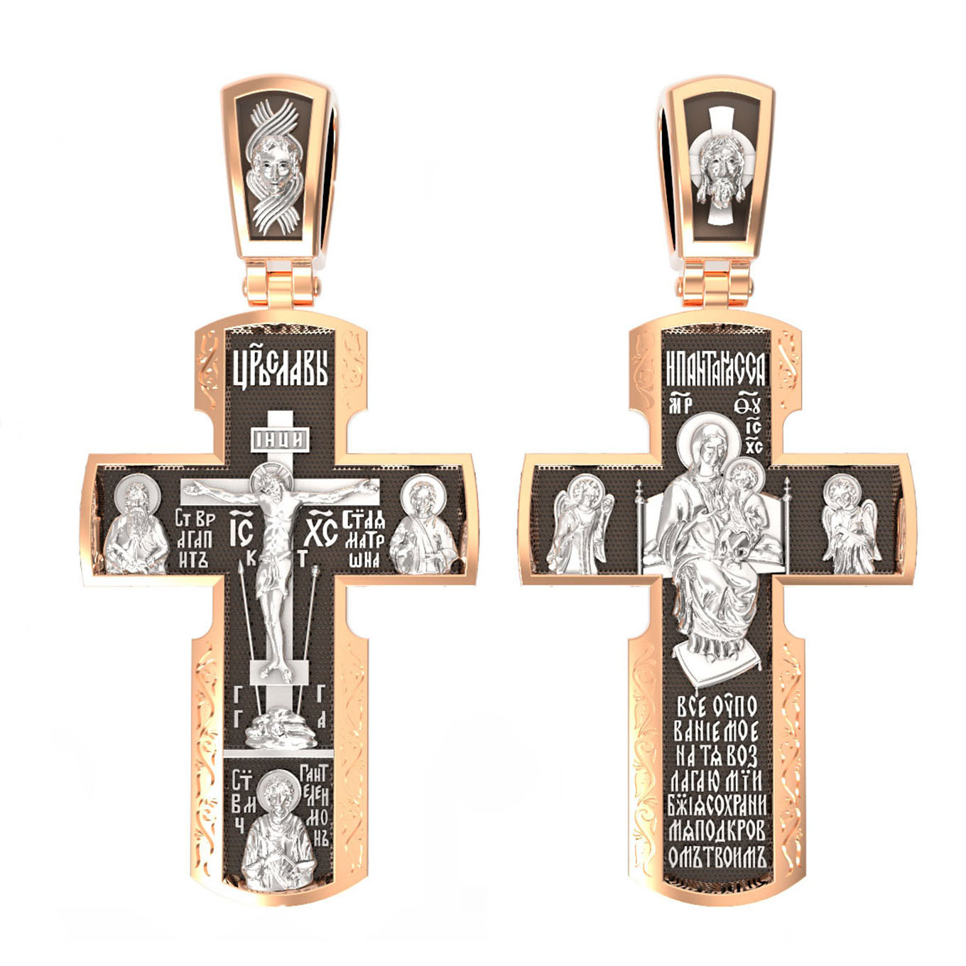 Как действенная помощь в немощах и болезнях был создан крест с образами святых целителей и со знаменитой афонской иконой Божией Матери «Всецарица». Над титлом видим слова «ЦРЬ СЛВЫ» — Царь Славы. Верхняя перекладина символизирует собой табличку с надписью «IHЦI» — Иисус Назарянин Царь Иудейский. Под перекладиной пишется сокращенно имя Спасителя «IC XC» — Иисус Христос. Возвышение, на котором стоит Крест, символизирует гору Голгофу, на которой произошло Распятие. У подножия Креста изображают прах Адама, обозначенный черепом. Справа от Распятия помещен образ прославленной святой блаженной Матроны. Слева — икона преподобный Агапита. Этот святой жил в пещерах Киево-Печерского монастыря в XI веке и бескорыстно врачевал мирян и монахов. У основания Креста Господня изображен великомученик Пантелеимон Целитель. Господь даровал удивительную силу его молитве. Ею он исцелял любые болезни и даже воскрешал умерших.