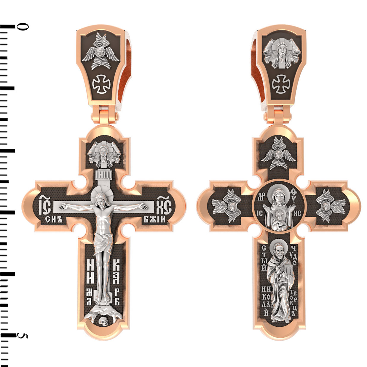 На лицевой стороне нательного креста по традиции изображено Распятие Господа нашего Иисуса Христа. Крест Господень стоит на небольшом каменистом возвышении, символизирующем гору Голгофу, которая обозначена буквами МЛРБ (Место Лобное Рай Бысть). Над головой Господа на поперечной перекладине написано «ИНЦИ», что символизирует табличку, которая была прибита к Кресту, с надписью «Иисус Назорей Царь Иудейский». Этим иудеи хотели посмеяться над Христом, не зная, что распинают истинного Царя всех царей. По сторонам основной перекладины расположены позолоченные рельефные инициалы Христа «ИС ХС». Под перекладиной, по сторонам древа, находится надпись «СЫН БОЖИЙ», а в основании креста — надпись «НИКА» (Победитель).