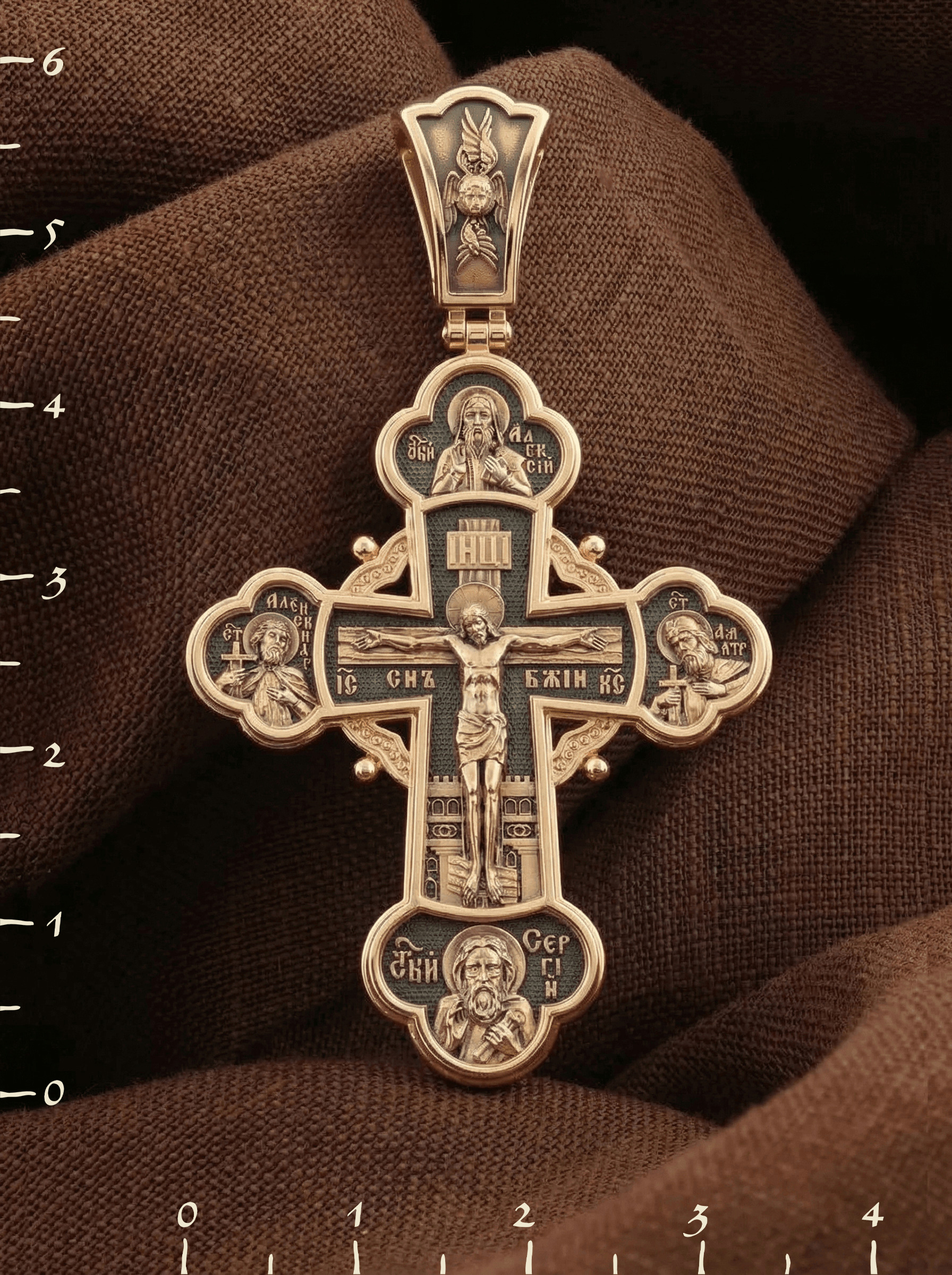 На лицевой стороне креста в центре изображено Распятие Господа Иисуса Христа. Слева от Господа находится святой благоверный князь Александр Невский, справа — святой благоверный князь Димитрий Донской. Святые князья почитаются как покровители воинов и защитники от врагов телесных и душевных. Вверху и над Распятием — образ митрополита московского святителя Алексия. Он почитается как помощник в воспитании детей и целитель, особенно при болезни глаз. Внизу — икона преподобного Сергия Радонежского, великого чудотворца и целителя. К нему обращаются в различных болезнях, тяжелых жизненных ситуациях, а также когда у детей возникают сложности в обучении.