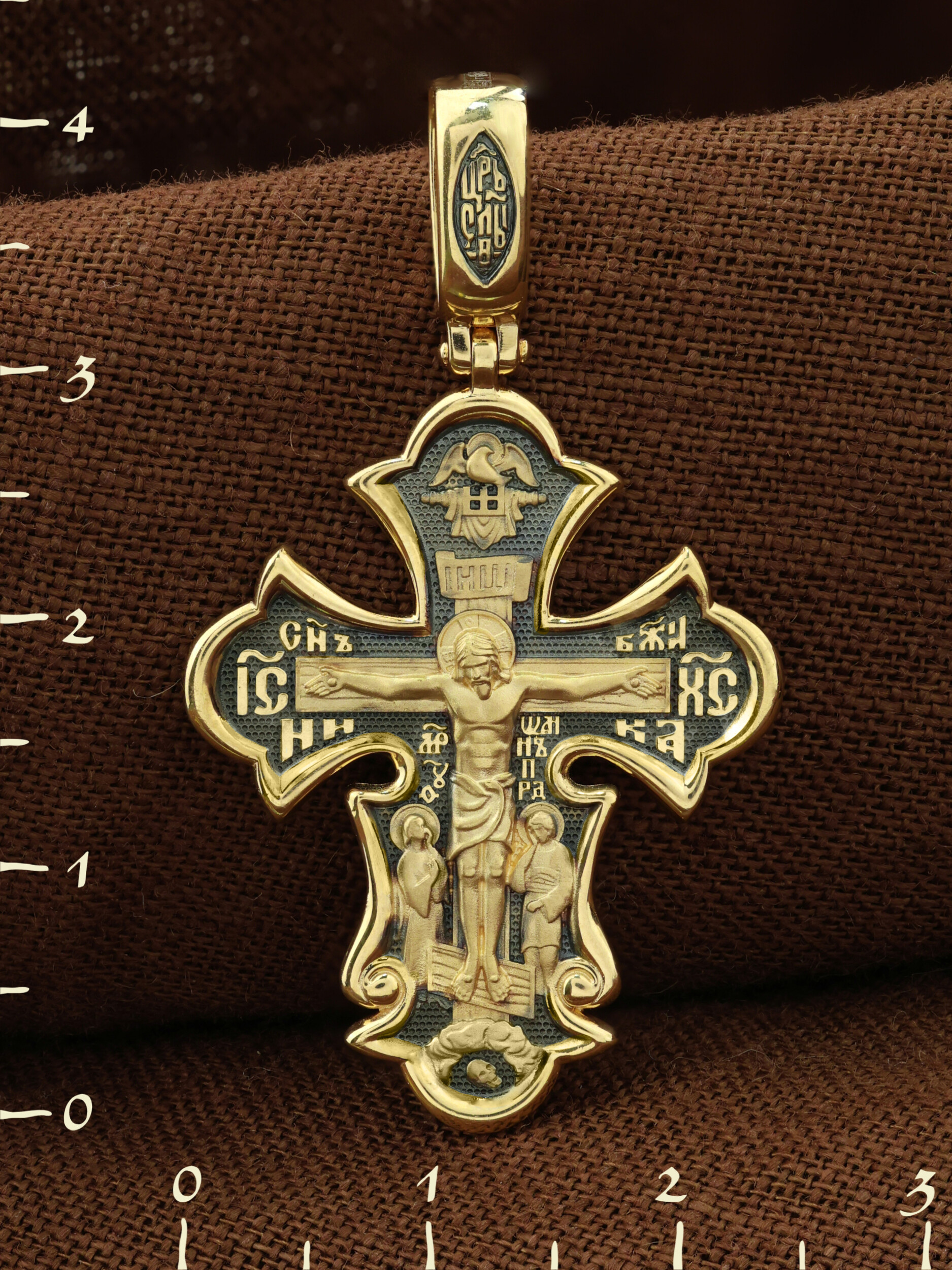 На лицевой стороне креста изображено Распятие Господа и Спасителя нашего Иисуса Христа, отдавшего Себя на смерть, для искупления грехов мира. Крест является символом жертвенной любви всеблагого Бога к падшим людям, всепобеждающим духовным оружием христиан, основанием и средоточием церковной жизни. Верхняя перекладина символизирует титло — табличку, на которой, согласно Евангелию, было начертано: Иисус Назорей Царь Иудейский (IНЦI). Также Распятие сопровождается надписями, олицетворяющими Христа. Надпись «IС» « ХС», что означает Иисус Христос, слово «НИКА», что означает «победитель» и слова «Сын Божий» помещается на разных сторонах поперечной перекладины креста. Над вершиной Распятия помещено изображение Святого Духа в виде голубя. Слева от Распятия изображена Пресвятая Богородица, справа — апостол и евангелист Иоанн Богослов, один из ближайших учеников Иисуса Христа. Возвышение, на котором стоит Крест, символизирует гору Голгофу, на которой произошло Распятие. Под подножием Креста изображена покоящаяся голова (череп) Адама. На кулонном кольце помещена надпись «Царь Славы».
