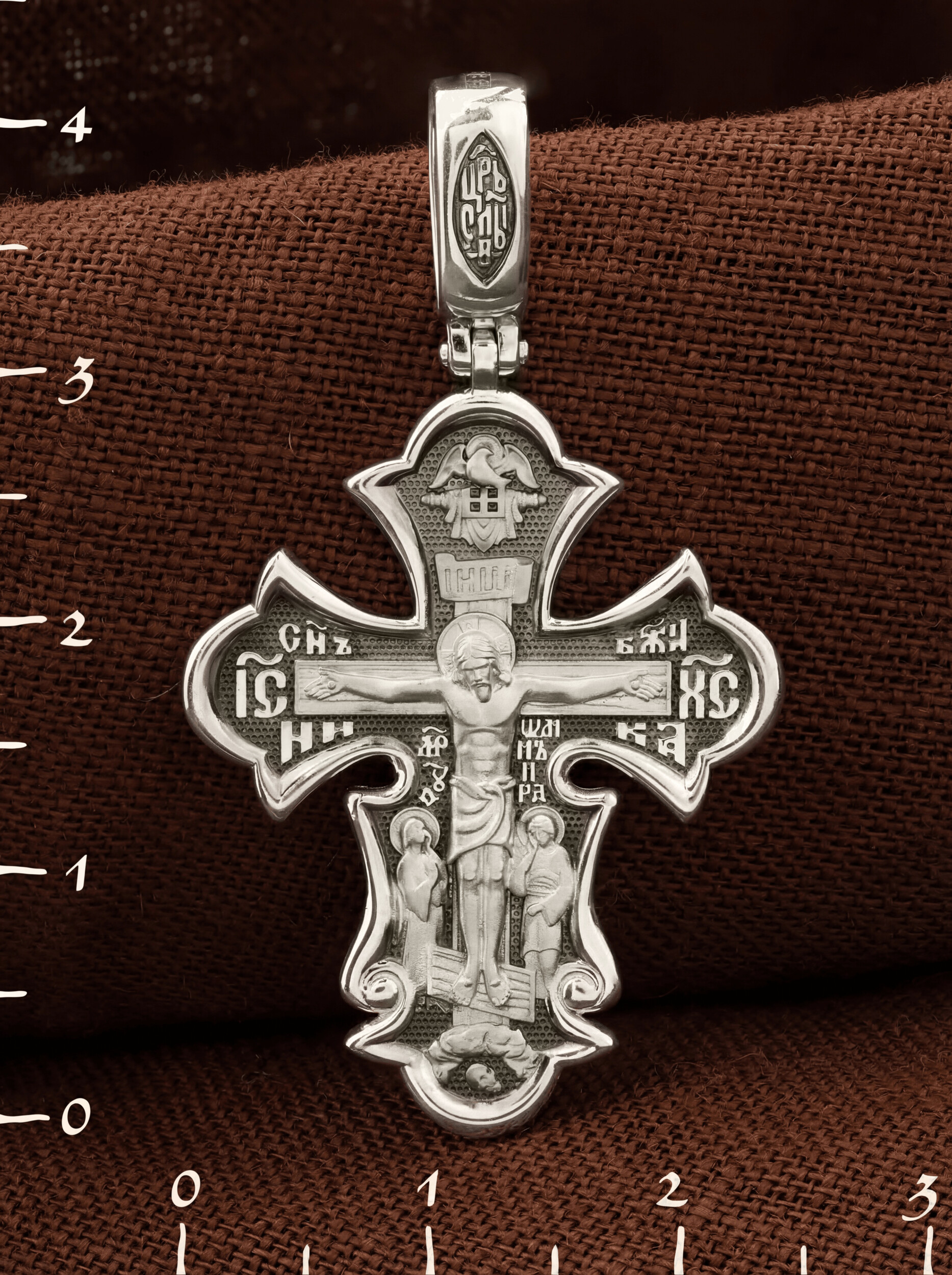 На лицевой стороне креста изображено Распятие Господа и Спасителя нашего Иисуса Христа, отдавшего Себя на смерть, для искупления грехов мира. Крест является символом жертвенной любви всеблагого Бога к падшим людям, всепобеждающим духовным оружием христиан, основанием и средоточием церковной жизни. Верхняя перекладина символизирует титло — табличку, на которой, согласно Евангелию, было начертано: Иисус Назорей Царь Иудейский (IНЦI). Также Распятие сопровождается надписями, олицетворяющими Христа. Надпись «IС» « ХС», что означает Иисус Христос, слово «НИКА», что означает «победитель» и слова «Сын Божий» помещается на разных сторонах поперечной перекладины креста. Над вершиной Распятия помещено изображение Святого Духа в виде голубя. Слева от Распятия изображена Пресвятая Богородица, справа — апостол и евангелист Иоанн Богослов, один из ближайших учеников Иисуса Христа. Возвышение, на котором стоит Крест, символизирует гору Голгофу, на которой произошло Распятие. Под подножием Креста изображена покоящаяся голова (череп) Адама. На кулонном кольце помещена надпись «Царь Славы».