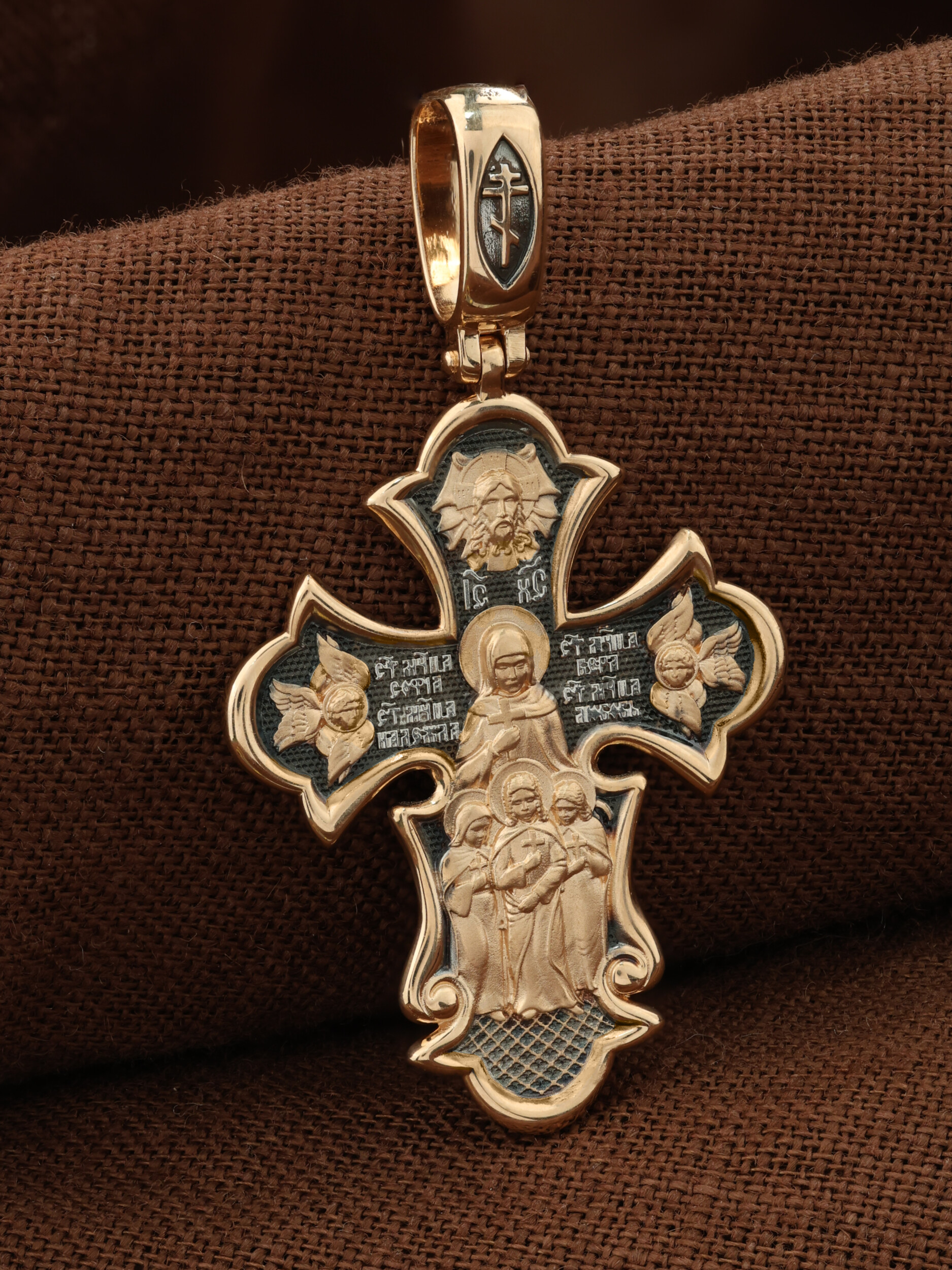 На оборотной стороне креста изображены Святые мученицы Вера, Надежда, Любовь и матерь их София, жившие во 2 веке нашей эры в Римской империи. Известно, что София была родом из Милана. Она рано овдовела, после чего перебралась в Рим. Своих дочерей София воспитывала в христианской вере и даже дала им имена в честь главных христианских добродетелей — Вера, Надежда и Любовь. В те годы римское государство жестоко преследовало верующих во Христа. Маленьких девочек (старшей Вере тогда было всего 12, а младшей Любови лишь 9) арестовали, подвергли истязаниям, а затем умертвили на глазах их матери. Сама София скончалась на следующий день у могилы своих дочерей. Но трагическая судьба на земле обернулась для мучениц вечной славой в ином мире. Церковь причислила их к лику святых и сегодня по молитвам к ним происходят чудеса. Выше образов мучениц изображен Спас Нерукотворный — образ Господа и Спасителя нашего Иисуса Христа, чудесно отпечатавшийся на плате, котором Христос вытер свой лик. По обеим сторонам креста изображены Ангелы Серафимы. На кулонном кольце помещен крест.