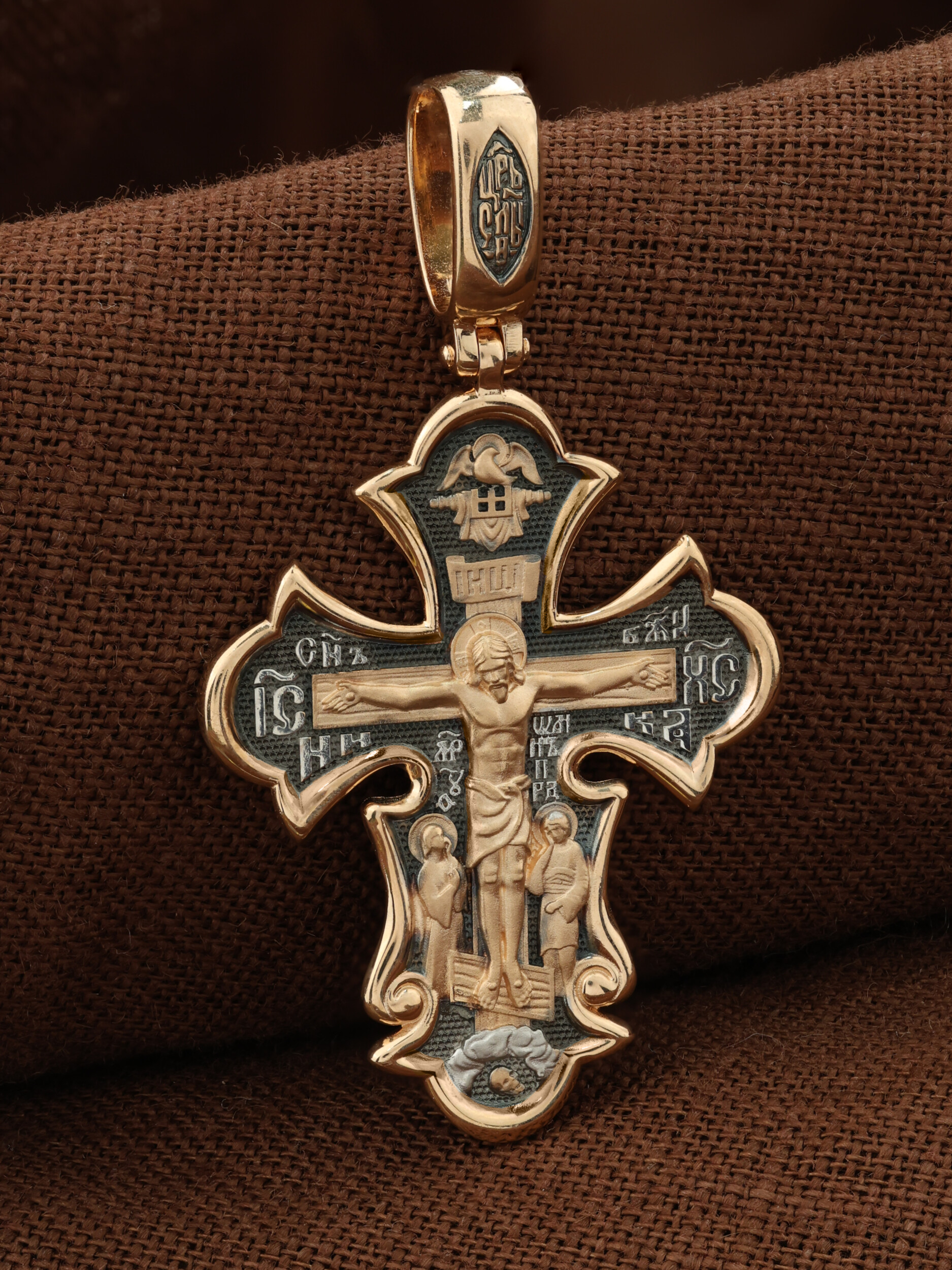 На лицевой стороне креста изображено Распятие Господа и Спасителя нашего Иисуса Христа, отдавшего Себя на смерть, для искупления грехов мира. Крест является символом жертвенной любви всеблагого Бога к падшим людям, всепобеждающим духовным оружием христиан, основанием и средоточием церковной жизни. Верхняя перекладина символизирует титло — табличку, на которой, согласно Евангелию, было начертано: Иисус Назорей Царь Иудейский (IНЦI). Также Распятие сопровождается надписями, олицетворяющими Христа. Надпись «IС» « ХС», что означает Иисус Христос, слово «НИКА», что означает «победитель» и слова «Сын Божий» помещается на разных сторонах поперечной перекладины креста. Над вершиной Распятия помещено изображение Святого Духа в виде голубя. Слева от Распятия изображена Пресвятая Богородица, справа — апостол и евангелист Иоанн Богослов, один из ближайших учеников Иисуса Христа. Возвышение, на котором стоит Крест, символизирует гору Голгофу, на которой произошло Распятие. Под подножием Креста изображена покоящаяся голова (череп) Адама. На кулонном кольце помещена надпись «Царь Славы».