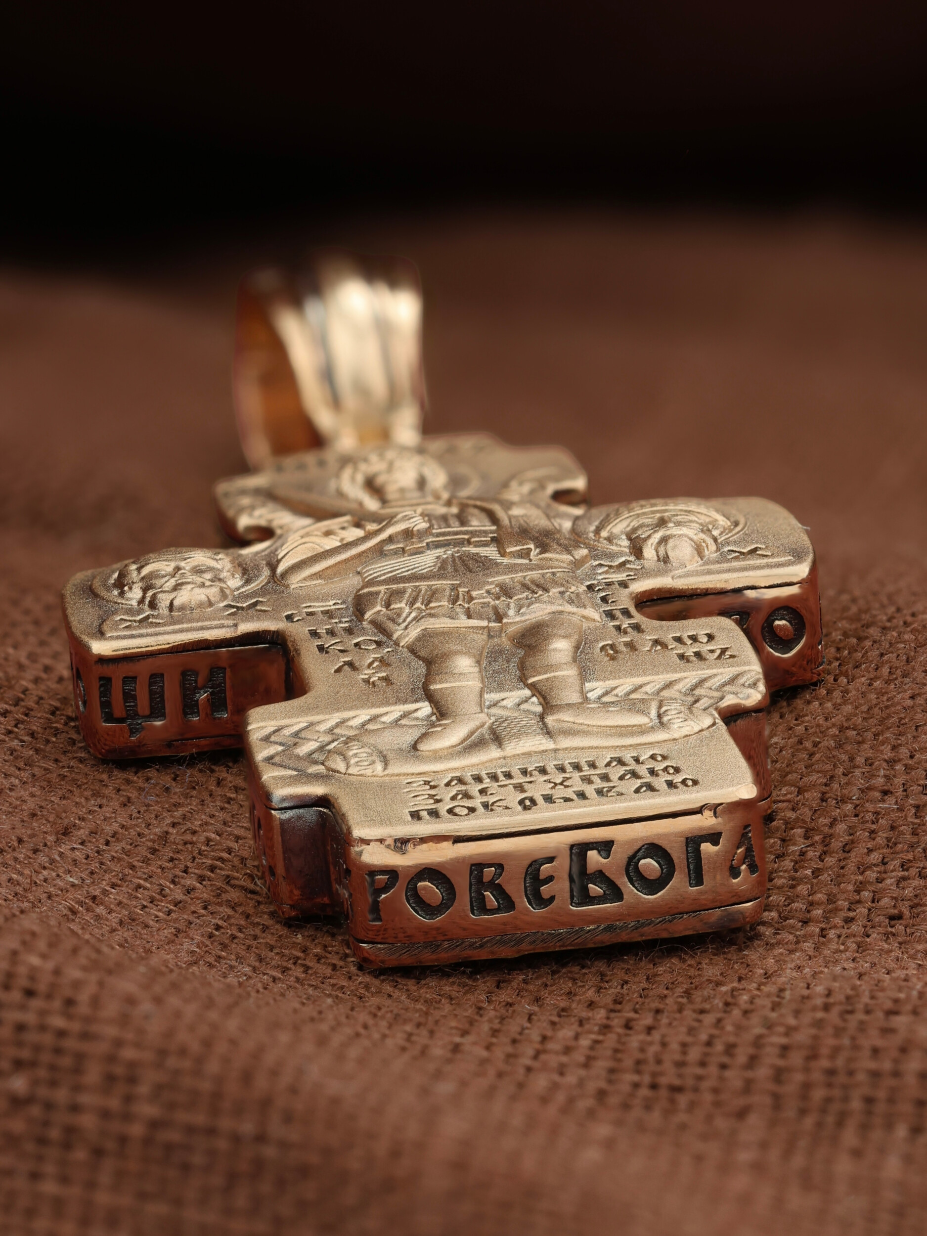 Центральную часть оборотной стороны креста занимает изображение Архангела Михаила — верного служителя Божия, который низринул с Неба возгордившегося денницу с другими павшими духами. В Православии его называют Архистратигом, что означает глава святого воинства Ангелов и Архангелов. Архангел Михаил изображен в воинственном виде с огненным мечом в правой руке. Архангел почитается как покровитель воинов и всех верных Богу и ведущих борьбу против сил зла, борец против ересей, а также защитник душ умерших, страж райских врат. С древних времен прославлен своими чудесами Архангел Михаил на Руси. Слева от образа Архангела изображен Святитель Николай Чудотворец, архиепископ Мир Ликийских, справа — Святитель Спиридон Тримифутский Чудотворец. Святители являются одними из самых почитаемых святых в православном мире. На торцевой стороне креста размещены слова молитвы из 90-го псалма: «Живый в помощи Вышняго, в крове Бога Небеснаго водворится. Речет…»
