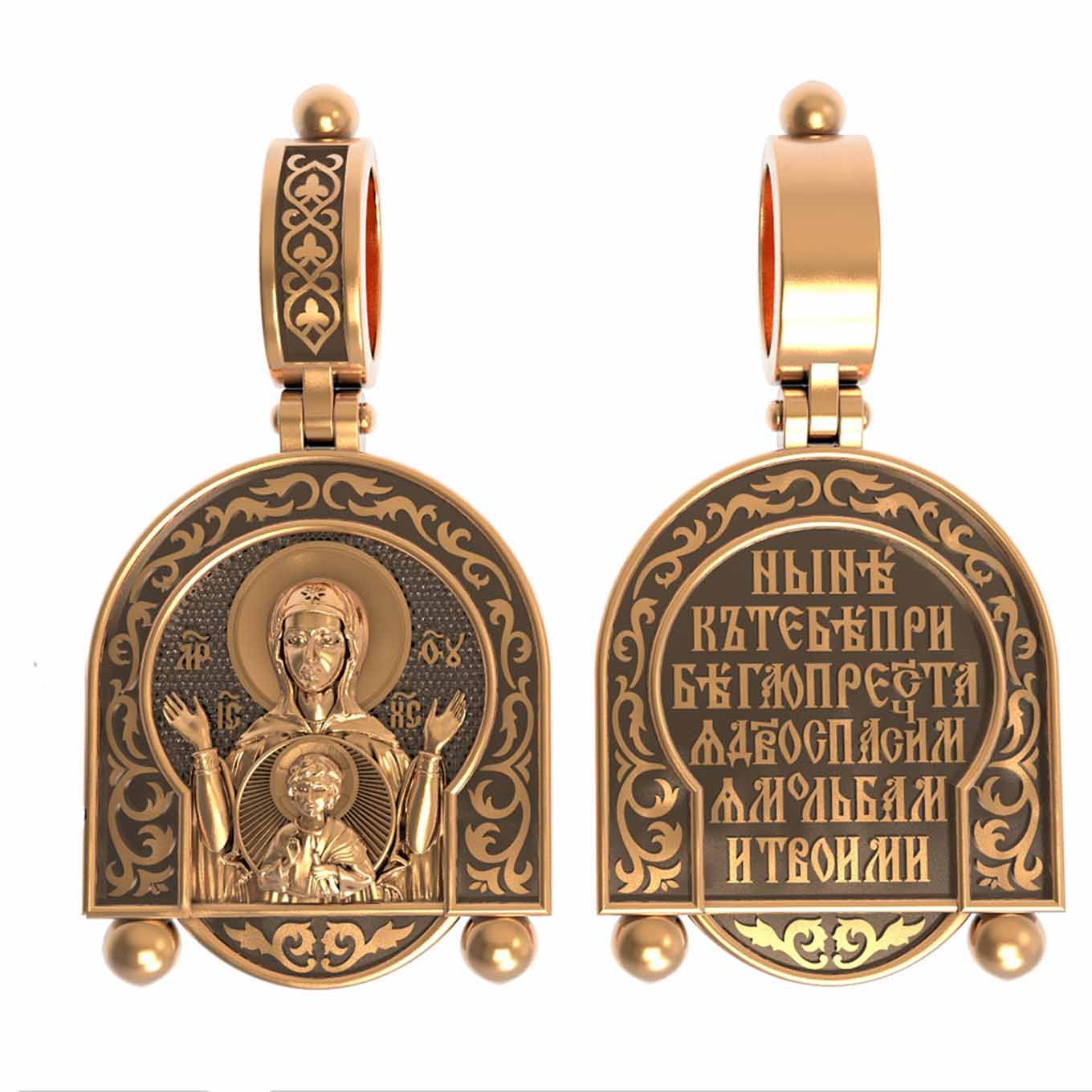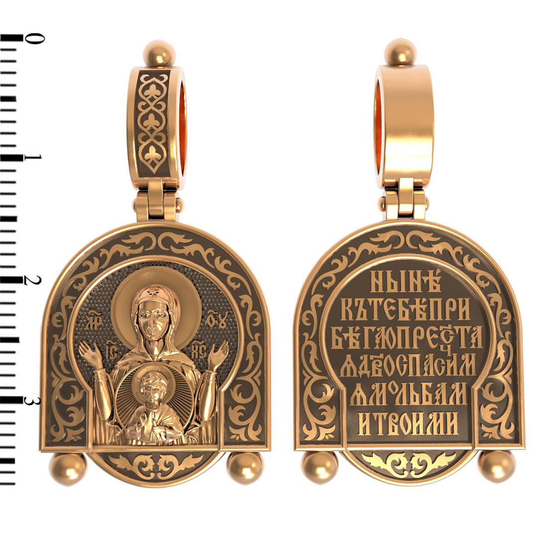 В центр образка помещен образ Божией Матери «Знамение», прославившийся многими чудесами в Новгороде в XII веке. Икона эта чтится как одна из самых великих святынь Русской земли. Молитвенно воздетые руки Богородицы означают заступничество за людей пред Богом. Рядом с Ней, на фоне круглого щита, — благословляющий Божественный Младенец — Спас-Эммануил.