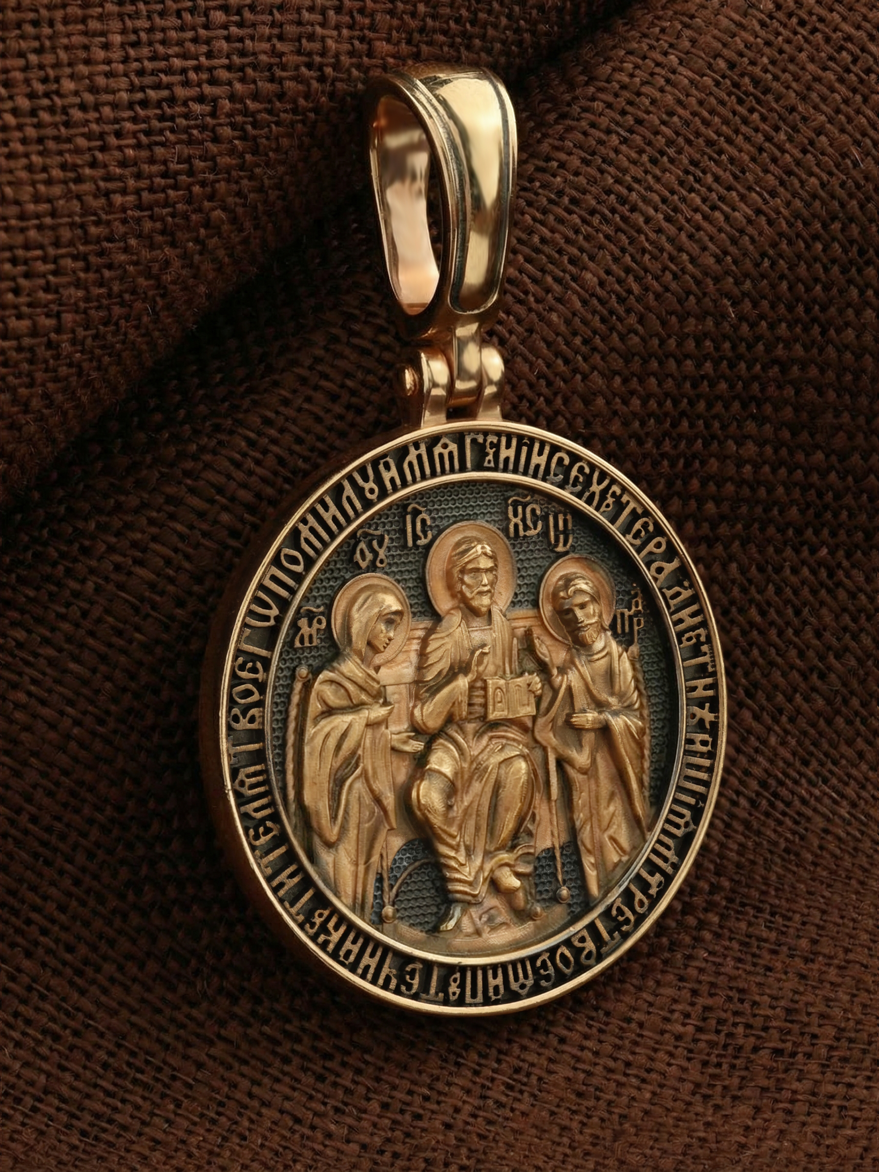 На лицевой стороне образка изображена икона Иисуса Христа Деисус. Он представлен в образе Господа Вседержителя, восседающего на престоле. В его руках — Книга Судеб всего человечества. С двух сторон ему предстоят Пресвятая Богородица и пророк Иоанн Предтеча, Креститель Господень. Первыми помощниками и заступниками человека в его земной жизни являются Матерь Божия и Иоанн Креститель. Поэтому каждый верующий в первую очередь к ним обращает свои молитвы с просьбой о духовной помощи. Такая молитва-прошение помещена на образке: «Господи Иисусе Христе, ради честнейшия Матери Твоея и Предтечи и Крестителя Твоего, помилуй мя».
