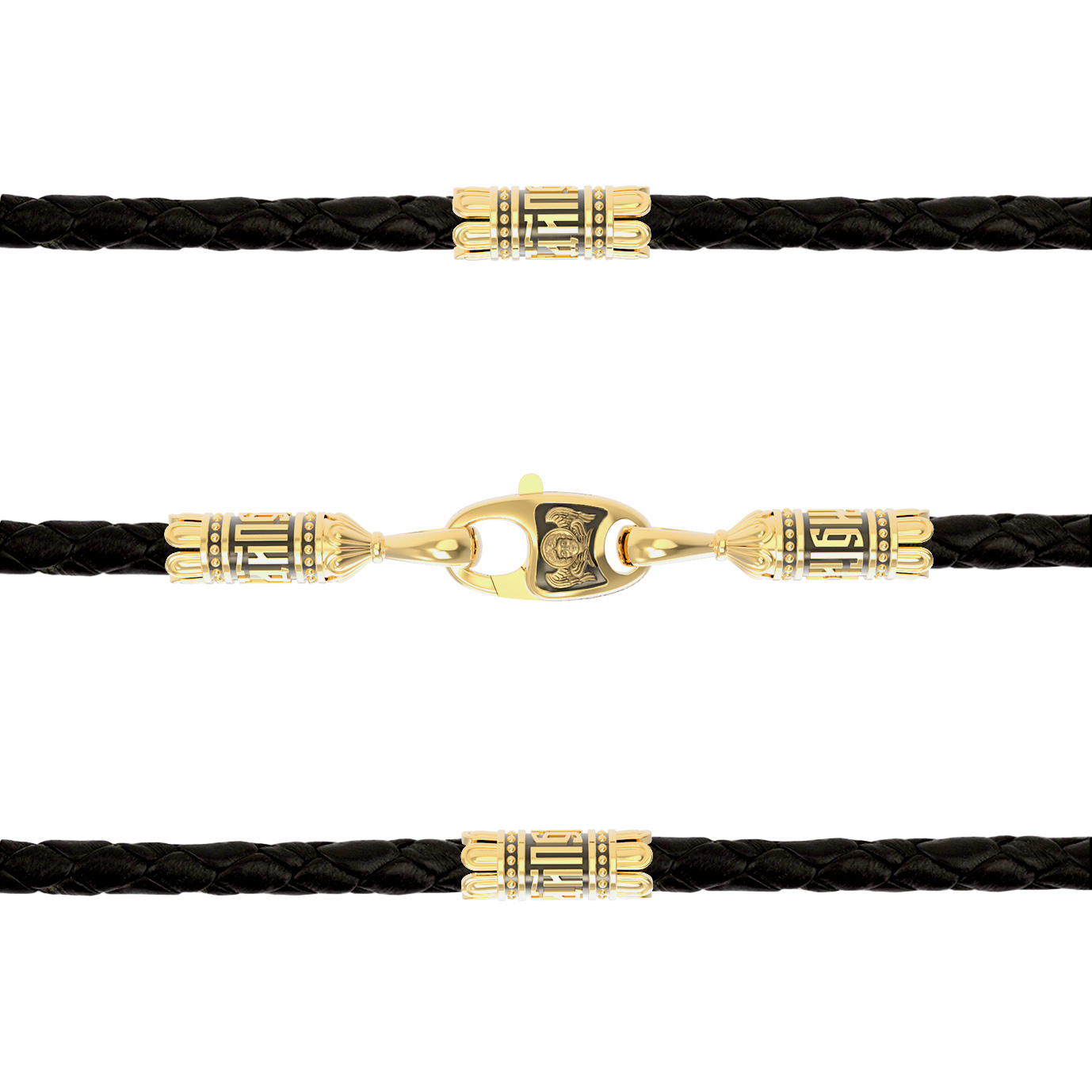 На шнурке цепи-шнурка расположены вставки, а на концах концевики с надписью: «Спаси и сохрани». Соединяет концевики замочек-карабин в форме рыбки. На замочке изображен шестикрылый Серафим.
