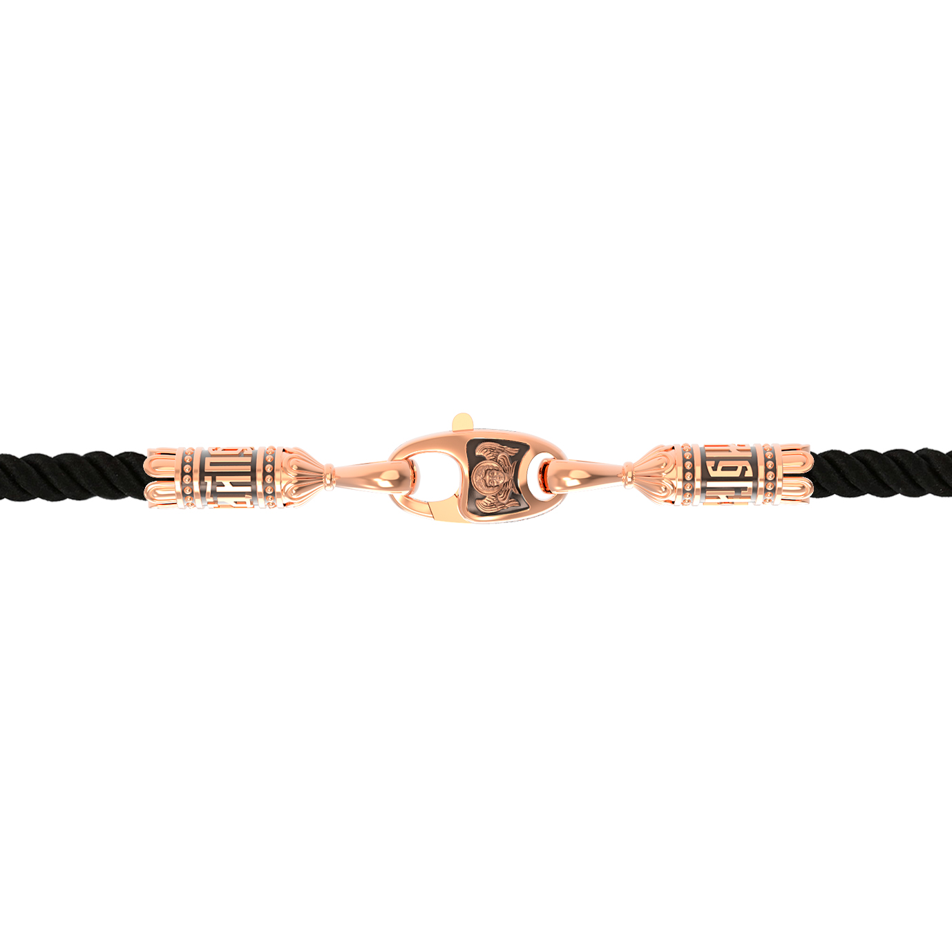 На концах цепи-шнурка расположены концевики с надписью: «Спаси и сохрани». Соединяет концевики замочек-карабин в форме рыбки. На замочке изображен шестикрылый Серафим.