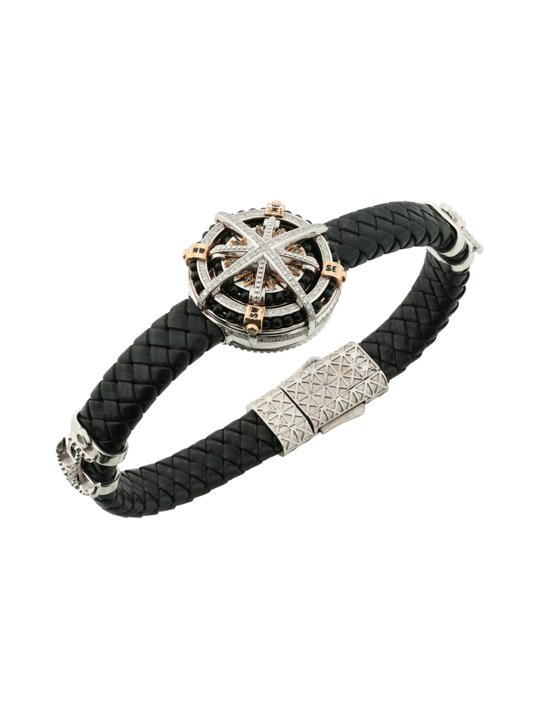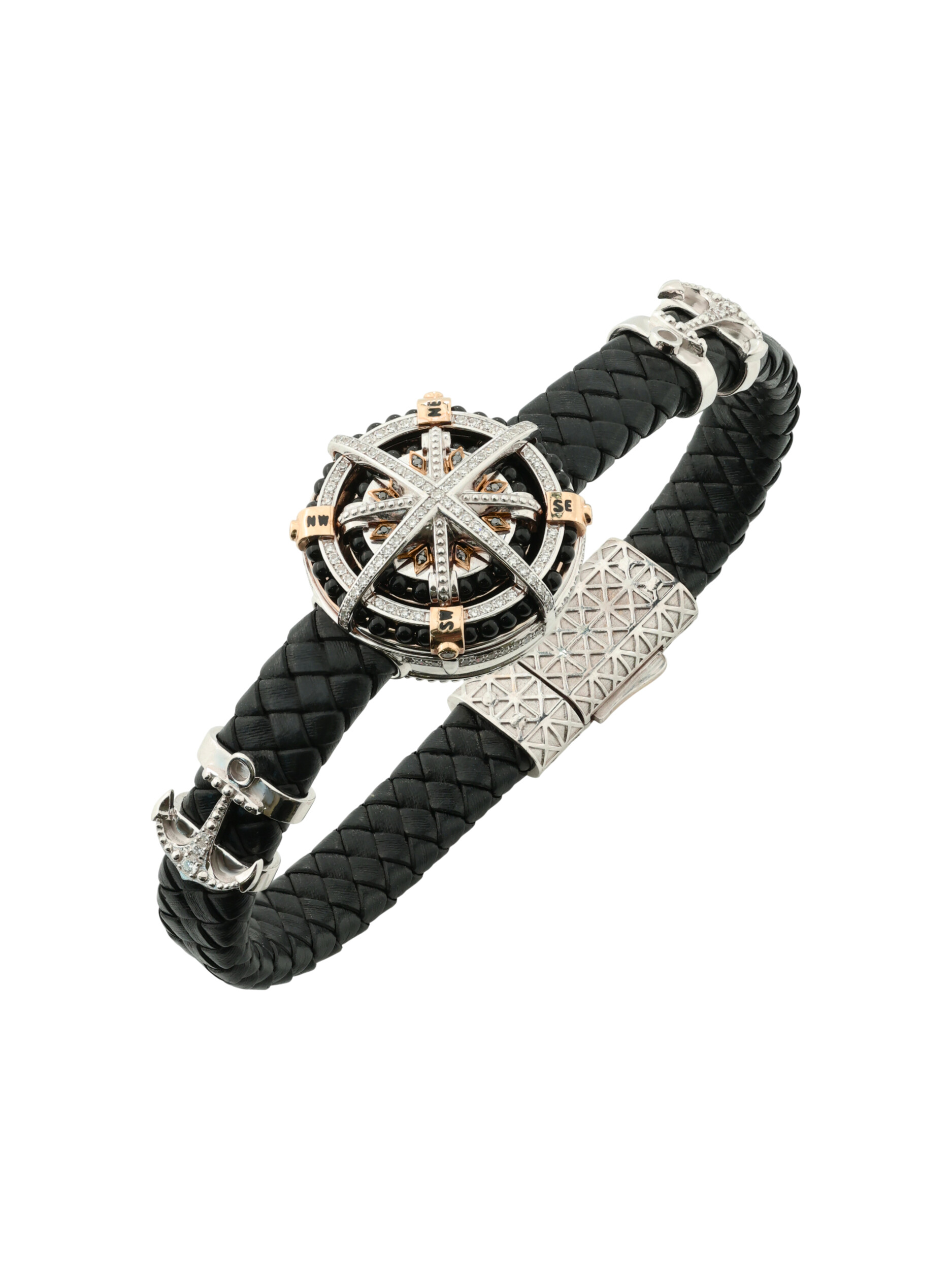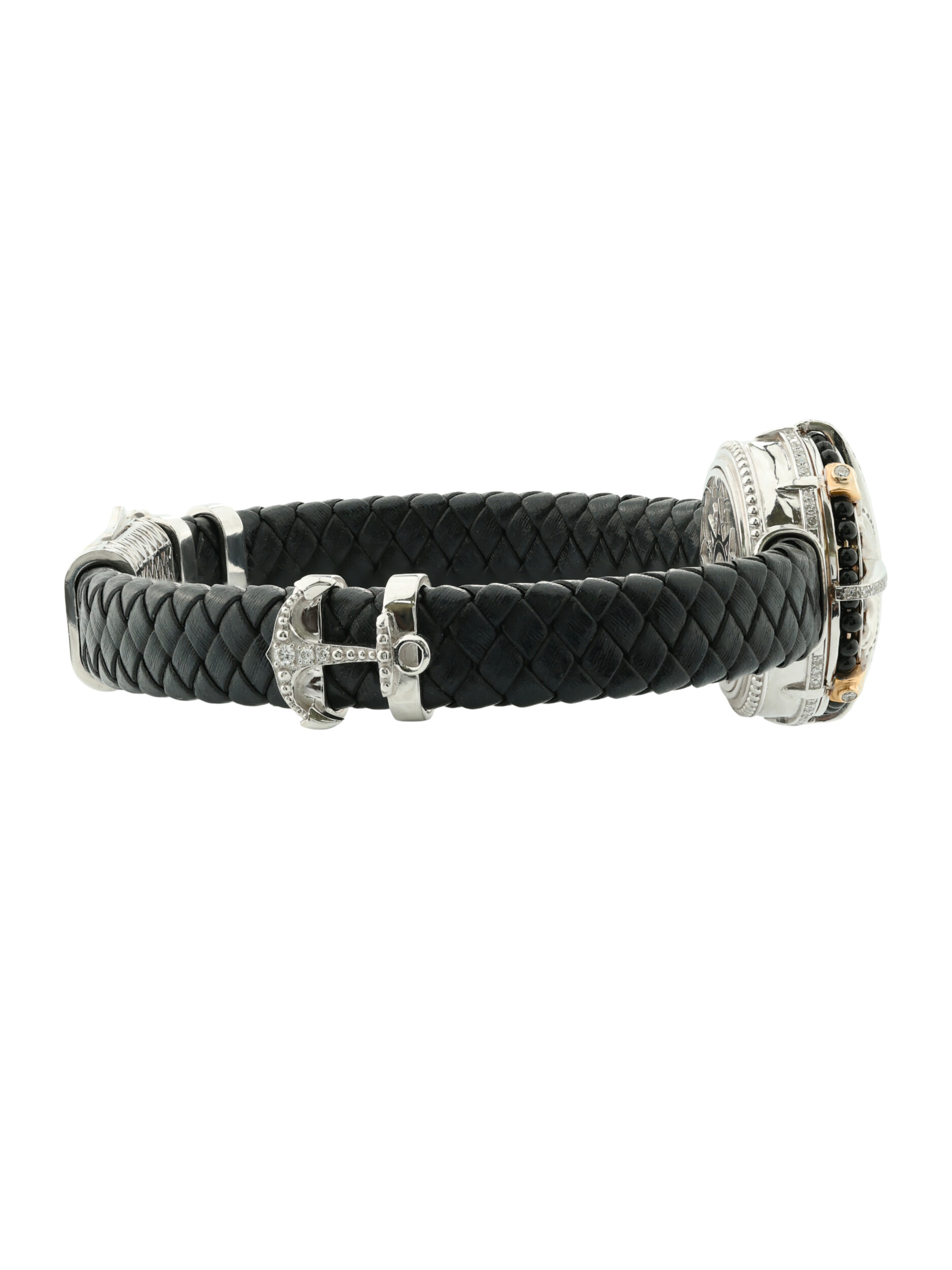 Браслет из белого золота c эмалью, бриллиантами, кожаным шнурком и ониксом