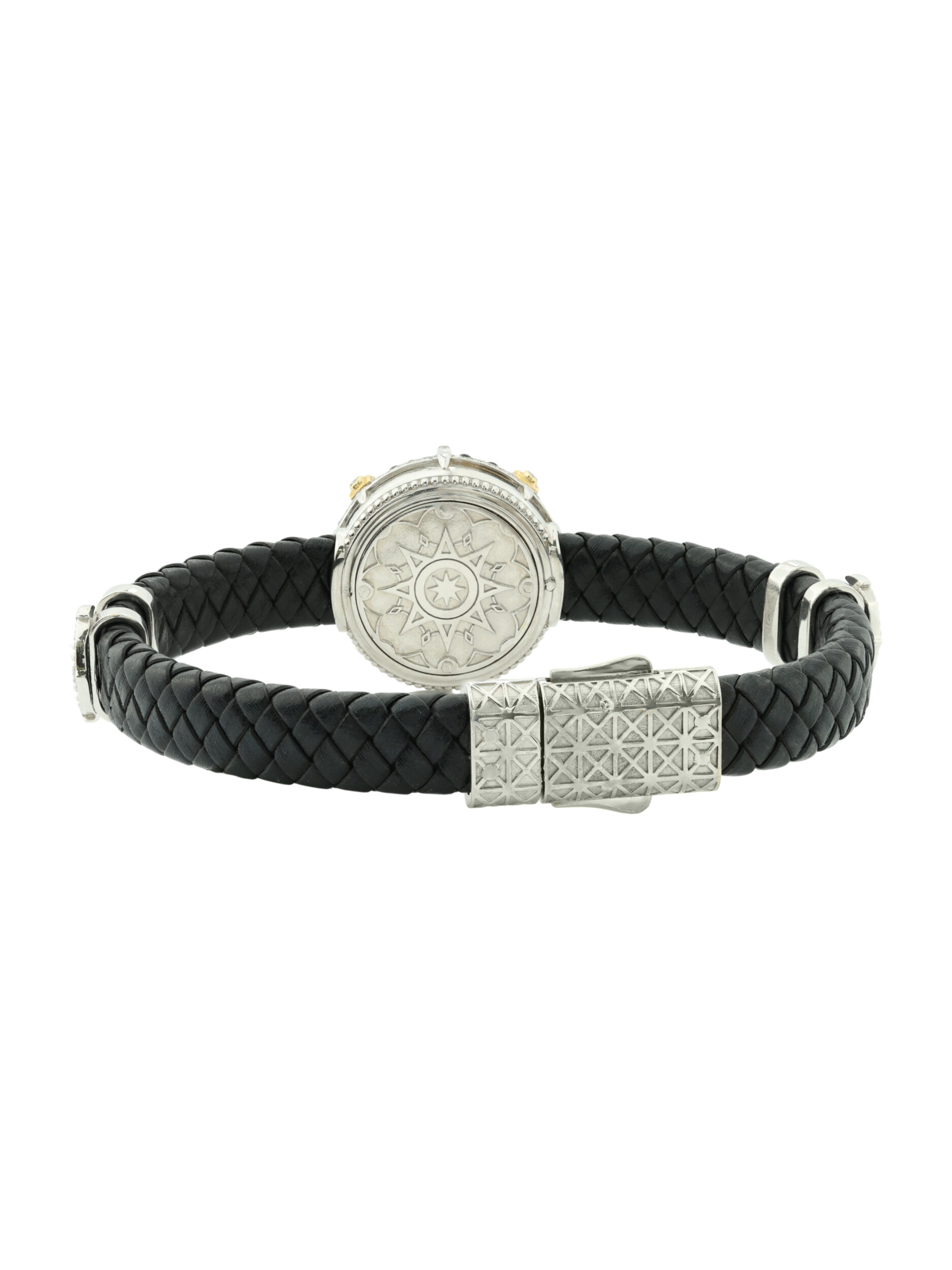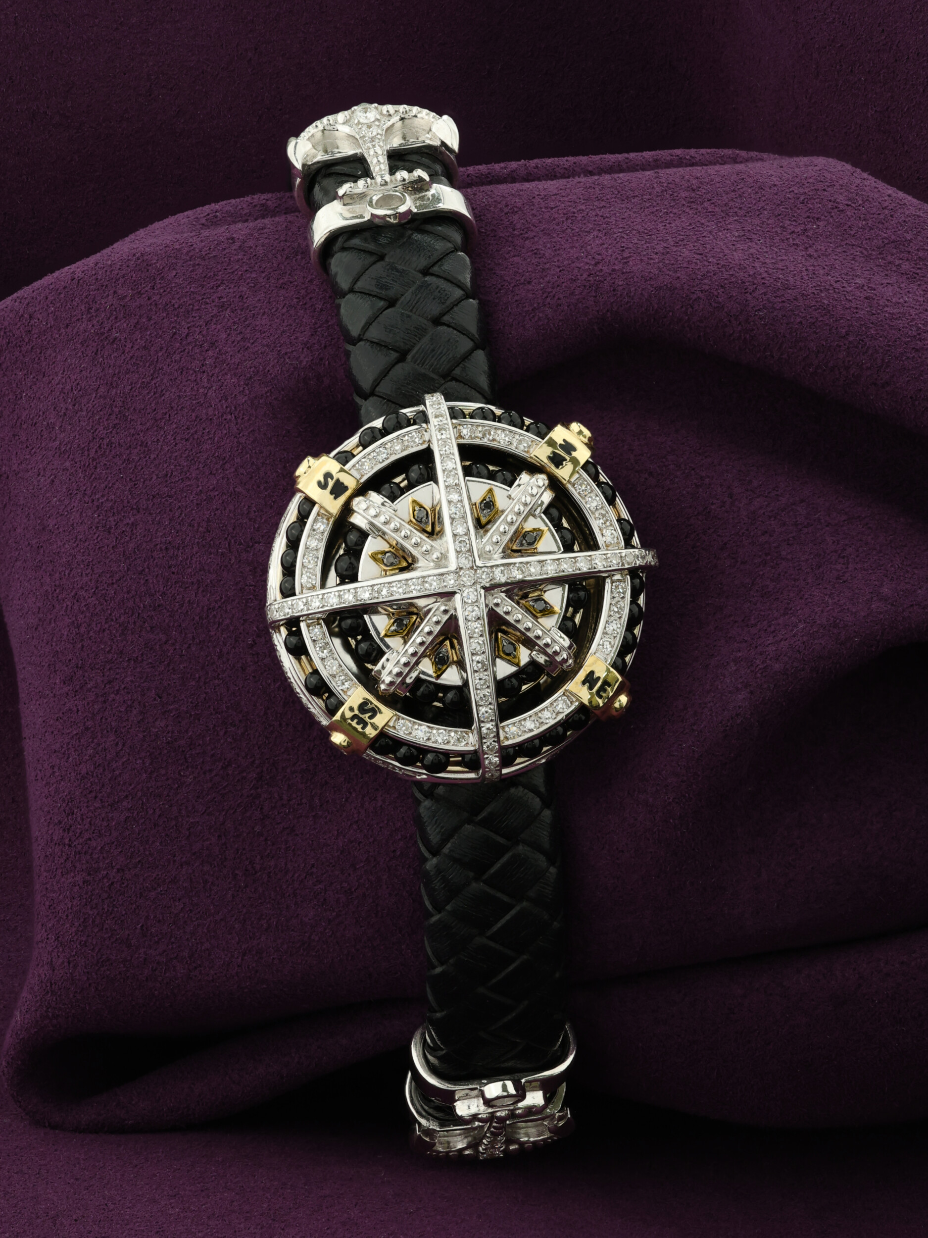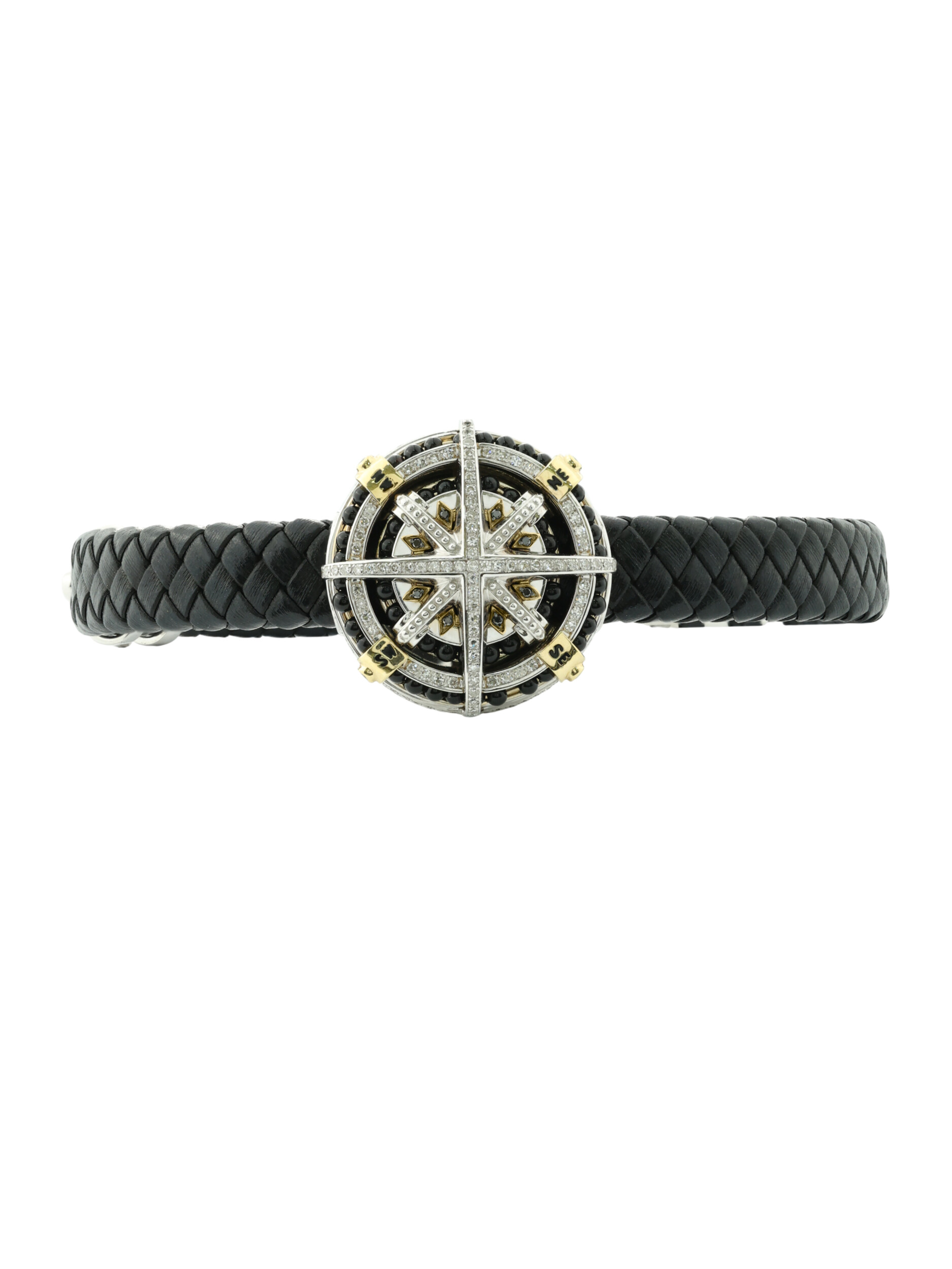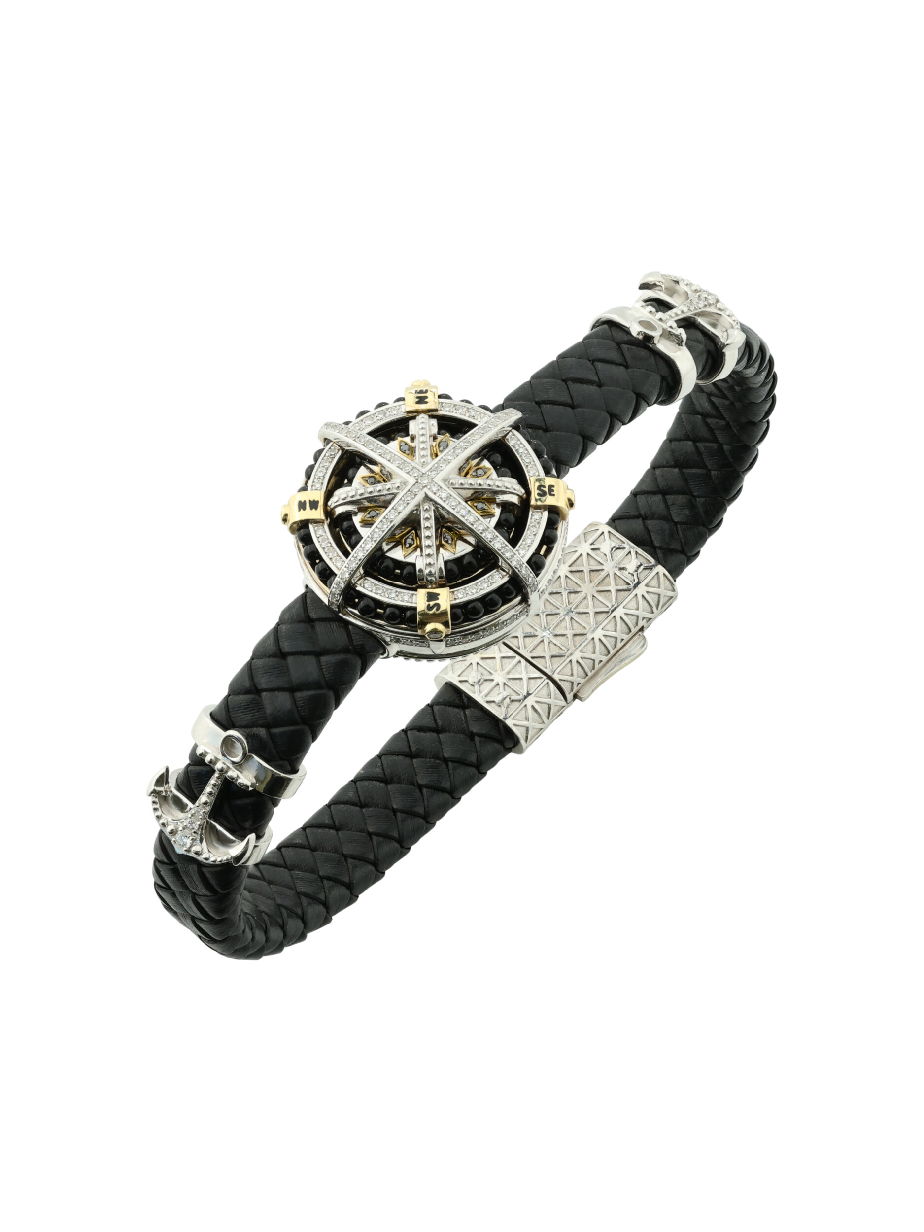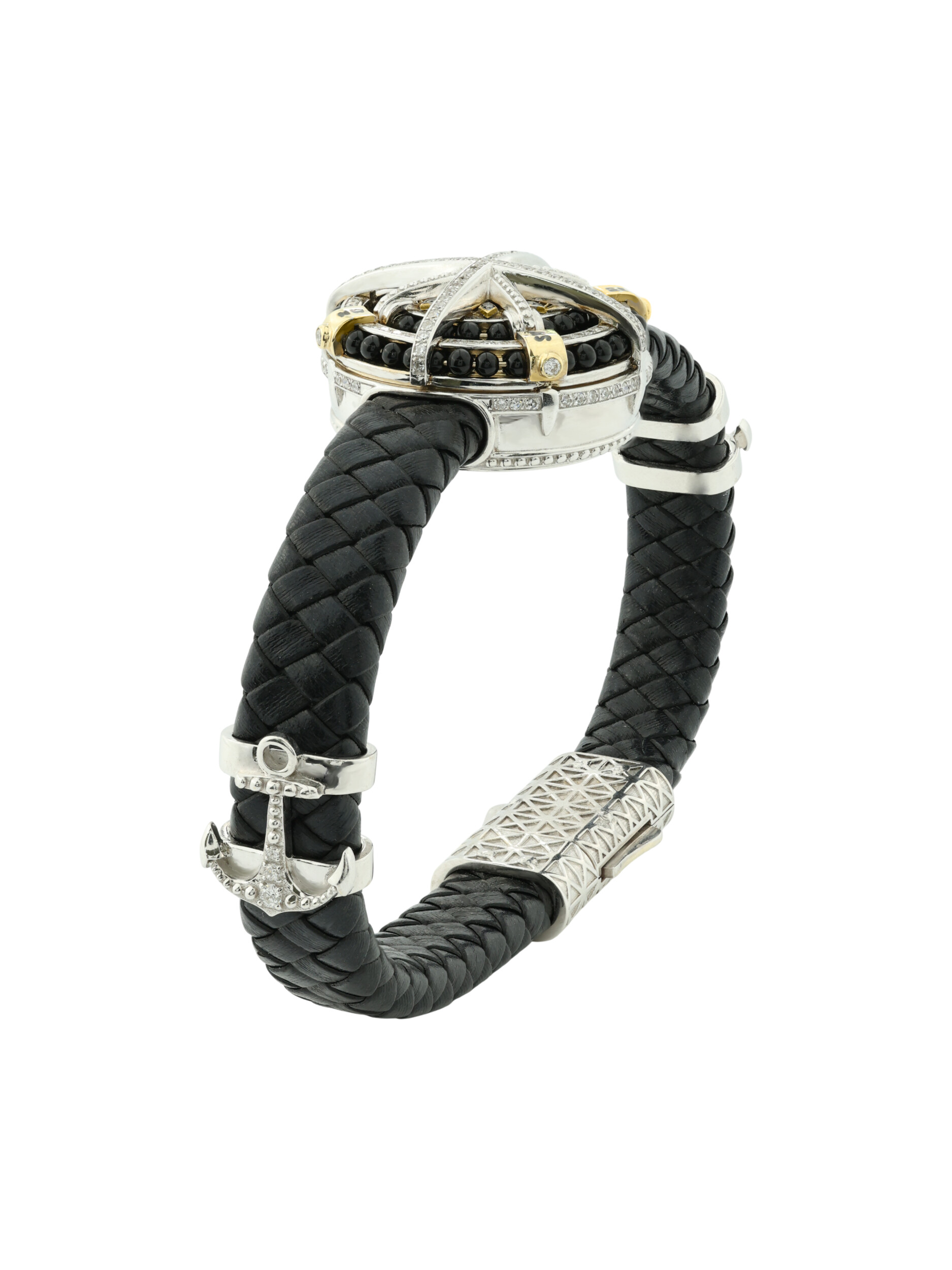 Браслет из белого золота c эмалью, бриллиантами, кожаным шнурком и ониксом