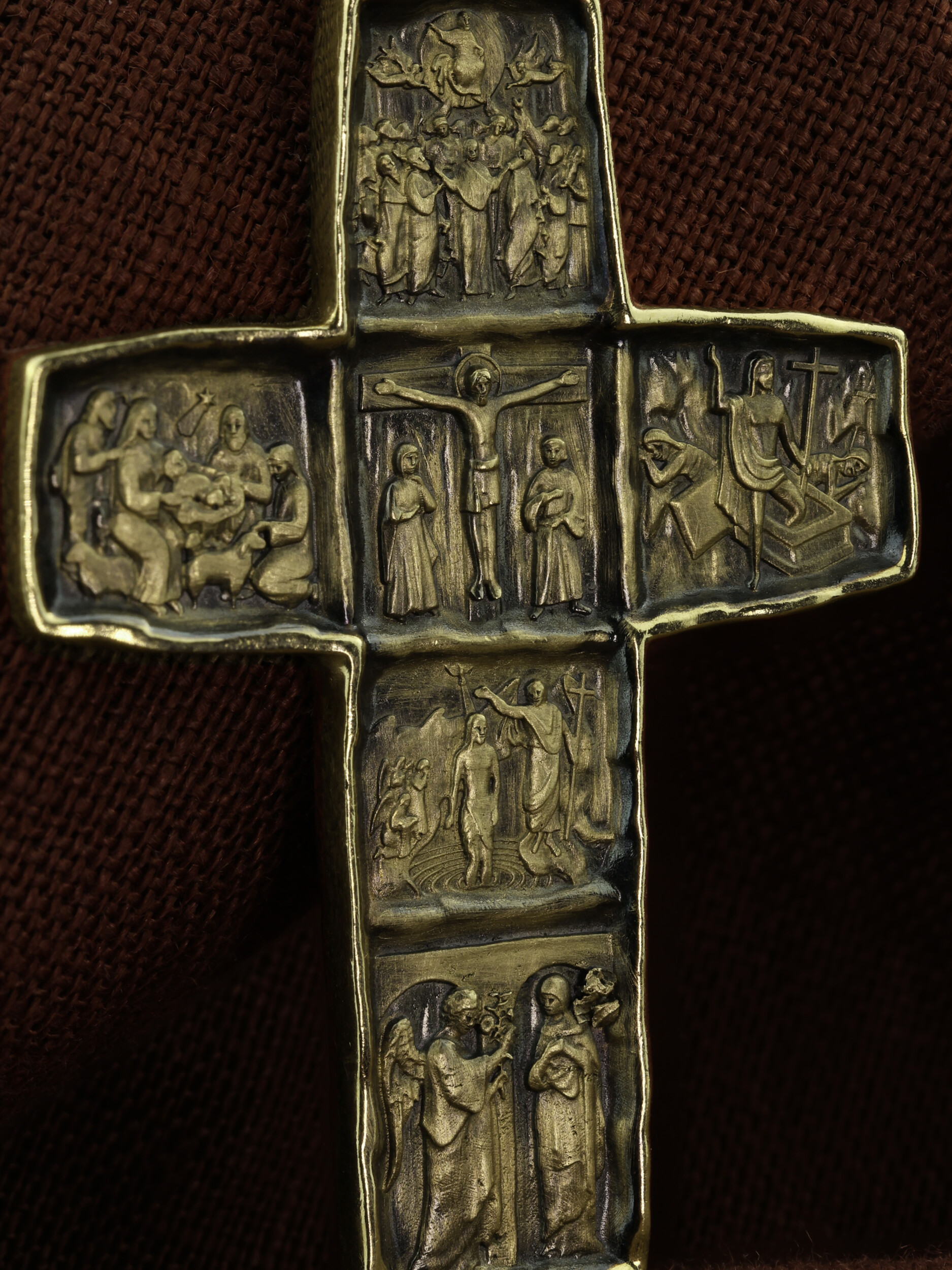 На лицевой стороне креста изображены основные события земной жизни, Крестные Страдания, Воскресение и Вознесение Господа и Спасителя нашего Иисуса Христа. Крест — символ спасения и искупления рода человеческого, знамение победы над смертью и адом. Иисус Христос, как искупительная жертва освобождения человечества от власти греха, умер крестной смертью и в третий день воскрес. В центре креста изображено Распятие Иисуса Христа на Кресте. Ниже Распятия размещено изображение Благовещения Пресвятой Богородицы, а так же Крещение Господне. Слева от Распятия изображено Рождество Господне, справа отображен образ Воскресшего из гроба Господа и Спасителя нашего Иисуса Христа. Над Распятием изображено Вознесение Господне.