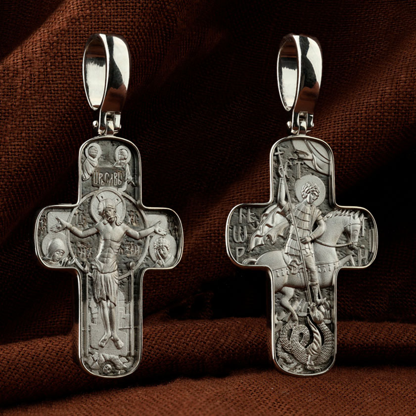 Основой композиции оборотной стороны креста является изображение Святого Великомученика Георгия Победоносца — одного из самых почитаемых и удивительных святых. На Руси он известен как Юрий или Егорий, покровитель воинов, помощник в крестьянском труде. На образке он изображен как воитель, сидящий на коне и поражающий копьем огнедышащего змея. Змей символизирует собою сатанинские силы. Молитвами вознесенными к Всевышнему и своей непреклонной верой он смог одолеть чудовище.. Над образом изображена благословляющая Божия десница.