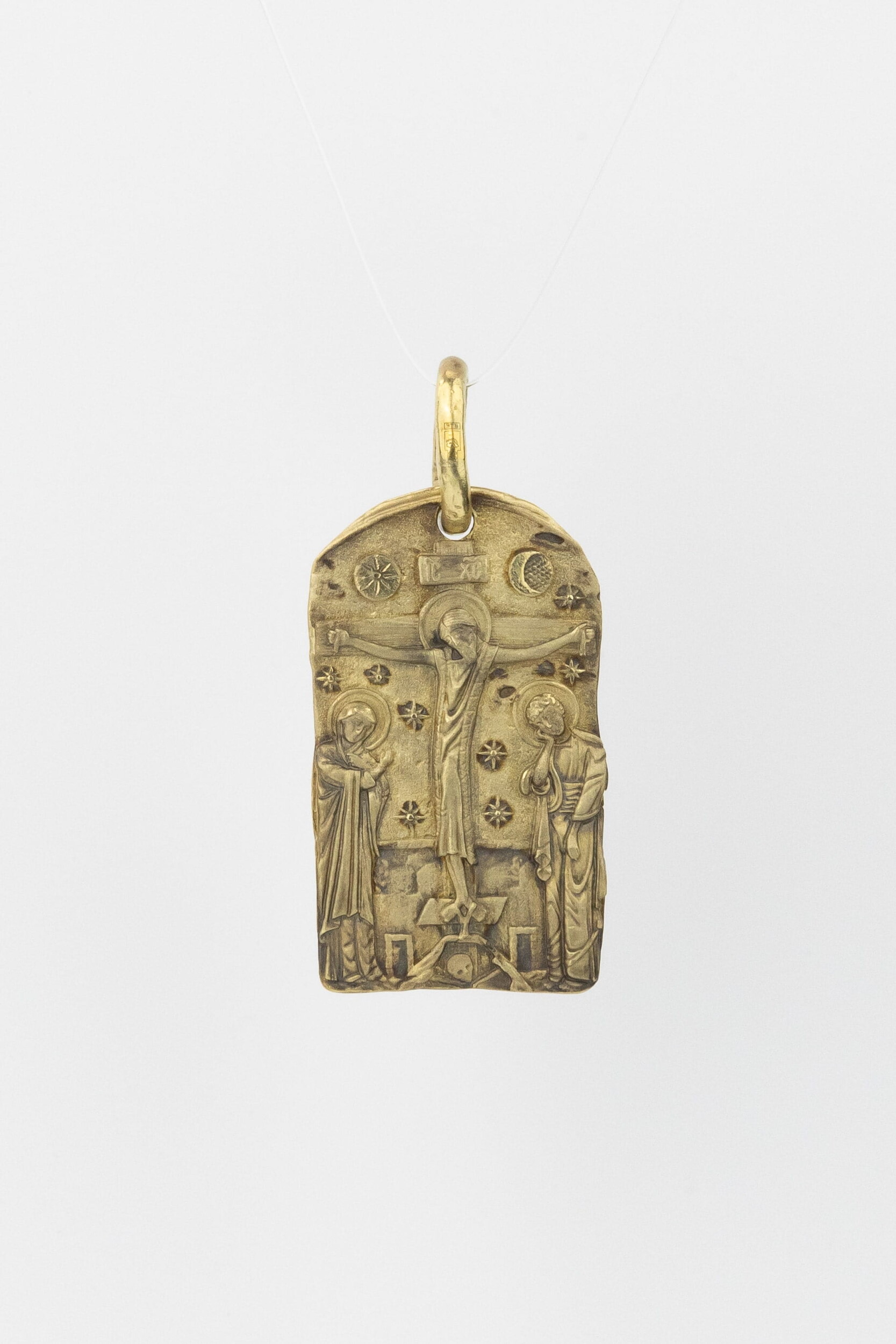 На лицевой стороне образка изображено Распятие Господа и Спасителя нашего Иисуса Христа. Своими крестными страданиями Господь смыл наши грехи, покрыл наш долг перед Богом. В Голгофе сокрыта непостижимая тайна бесконечной правды и любви Бога. Крест стал символом победы добра над злом, жизни над смертью, напоминанием бесконечной Божьей любви, предметом радости. Воплотившийся Сын Божий Своею кровью освятил крест и сделал его проводником Своей благодати, источником освящения верующих. На верхней табличке, выше головы Иисуса, написано сокращенно имя Спасителя «IC» «XC» — Иисус Христос. Слева от Распятия стоят оплакивающие Господа Пресвятая Богородица, справа — апостол и евангелист Иоанн Богослов, один из ближайших учеников Иисуса Христа. По преданию, увидя, что они горько плачут, Иисус сказал Матери Своей: «Жено! Се сын Твой!» Потом сказал ученику Иоанну: «Се мати твоя». С этого времени Иоанн взял Матерь Божию к себе, и Она жила в его доме до самой смерти.