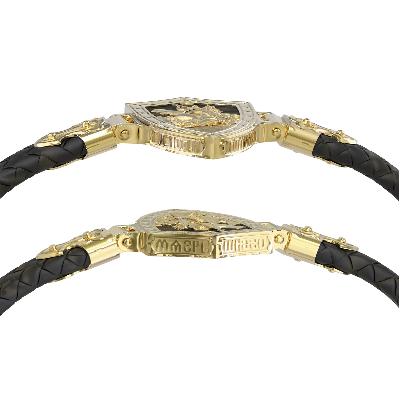 Основой композиции лицевой стороны браслета является изображение Святого Великомученика Георгия Победоносца — одного из самых почитаемых и удивительных святых. Георгий родился в Каппадокии (Малая Азия) в семье богатых и знатных горожан. Юношей поступил на службу к римскому императору Диоклетиану, за отличное знание военного дела и проявленную в боях и походах храбрость был приближен к императору и удостоен высокого воинского звания. Во время начавшихся гонений на христиан, перешел на сторону гонимых и, отвергнув человеческий страх, стал ярым проповедником учения Христа. Мучители подвергли опального воеводу жесточайшим восьмидневным пыткам и казнили его (обезглавили) в возрасте около тридцати лет в 303 году. На Руси он известен как Юрий или Егорий, заступник для верующих, чья жизнь имеет какое-либо отношение к военным делам, помощник в крестьянском труде. Браслет сделан в виде воинского щита. На нем Георгий изображен как воитель, сидящий на вздыбленном коне и поражающий копьем огнедышащего змея. Над образом изображена благословляющая Божия десница. Змей символизирует собою сатанинские силы. Молитвами вознесенными к Всевышнему и своей непреклонной верой он смог одолеть чудовище. Святой убил змея, спас царскую дочь, принесенную в жертву, и жителей города, их души от влияния дьявола, породив в них надежду и веру в Господа, призывая людей принять христианскую веру. На торце изделия помещена молитва: «Господи, помилуй мя грешного».