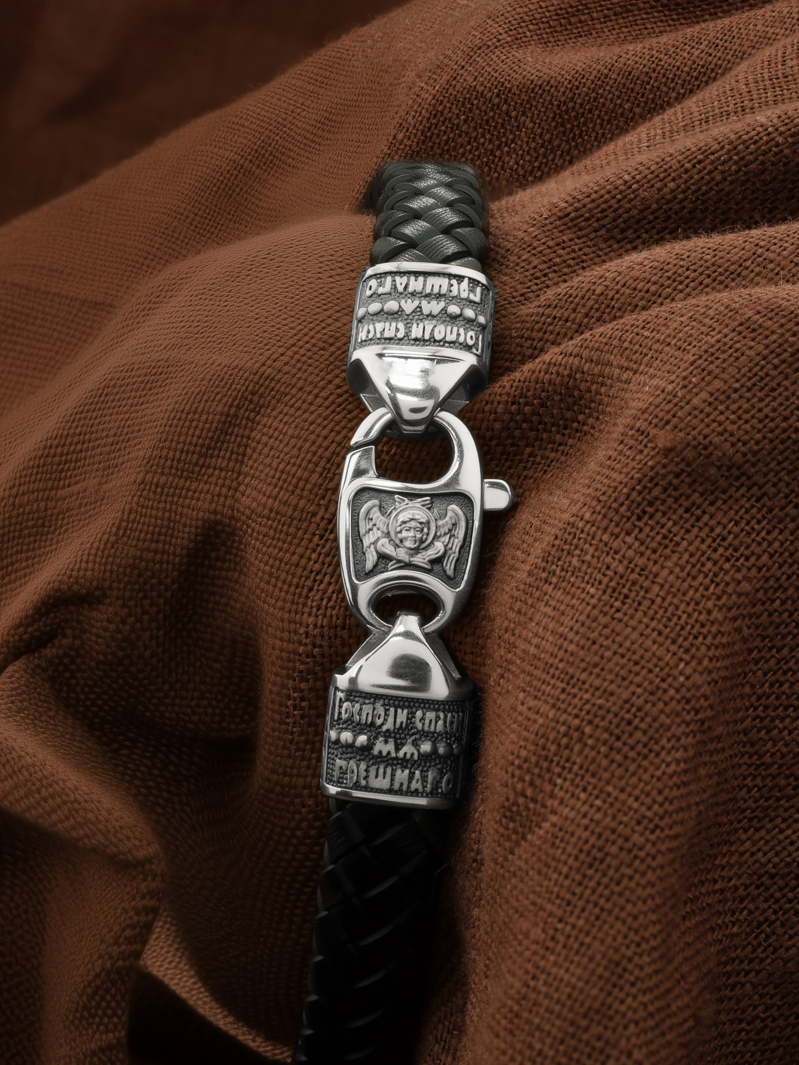 На концах расположены концевики с молитвой: «Господи, спаси мя грешного». Соединяет концевики замочек-карабин в форме рыбки. На замочке изображен шестикрылый Серафим — самый приближенный к Господу Ангел.