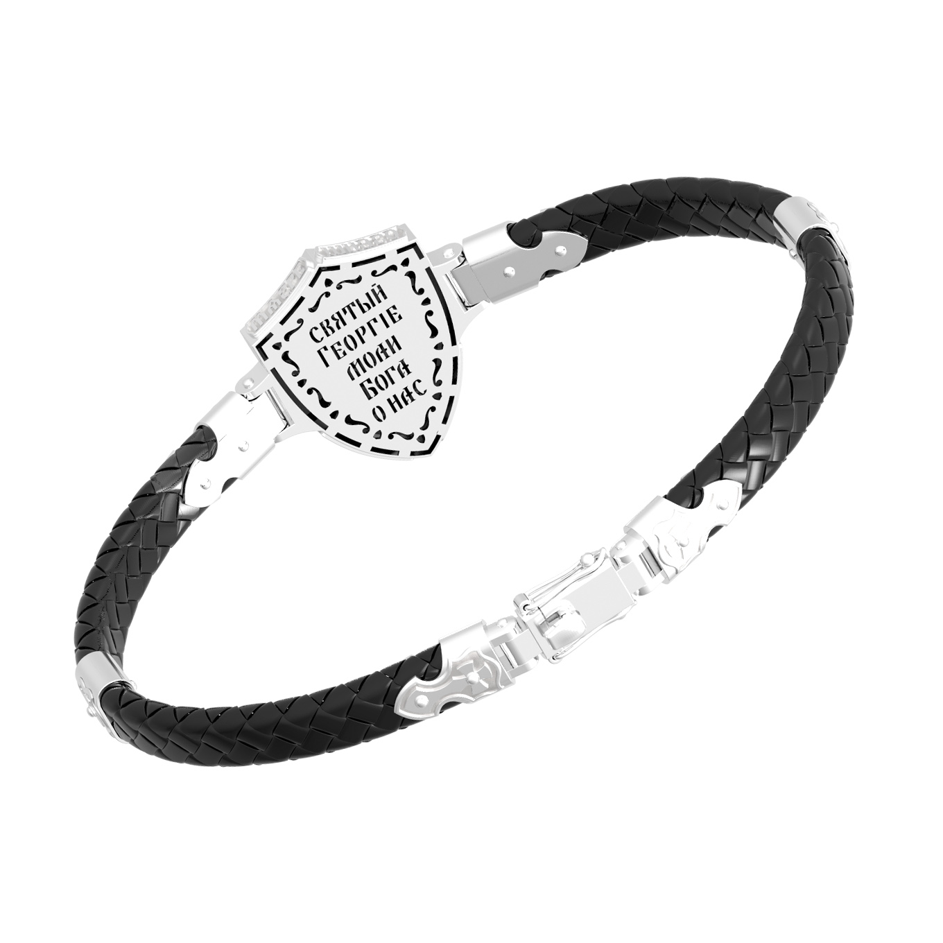 Основой композиции лицевой стороны браслета является изображение Святого Великомученика Георгия Победоносца — одного из самых почитаемых и удивительных святых. Георгий родился в Каппадокии (Малая Азия) в семье богатых и знатных горожан. Юношей поступил на службу к римскому императору Диоклетиану, за отличное знание военного дела и проявленную в боях и походах храбрость был приближен к императору и удостоен высокого воинского звания. Во время начавшихся гонений на христиан, перешел на сторону гонимых и, отвергнув человеческий страх, стал ярым проповедником учения Христа. Мучители подвергли опального воеводу жесточайшим восьмидневным пыткам и казнили его (обезглавили) в возрасте около тридцати лет в 303 году. На Руси он известен как Юрий или Егорий, заступник для верующих, чья жизнь имеет какое-либо отношение к военным делам, помощник в крестьянском труде. Браслет сделан в виде воинского щита. На нем Георгий изображен как воитель, сидящий на вздыбленном коне и поражающий копьем огнедышащего змея. Над образом изображена благословляющая Божия десница. Змей символизирует собою сатанинские силы. Молитвами вознесенными к Всевышнему и своей непреклонной верой он смог одолеть чудовище. Святой убил змея, спас царскую дочь, принесенную в жертву, и жителей города, их души от влияния дьявола, породив в них надежду и веру в Господа, призывая людей принять христианскую веру. На торце изделия помещена молитва: «Господи, помилуй мя грешного».