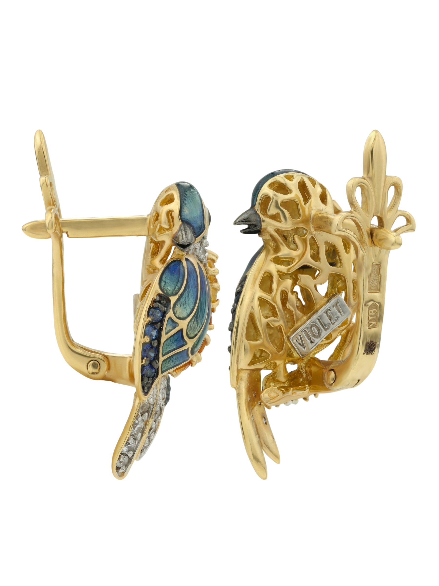 Серьги из лимонного золота c эмалью, фианитом, цитрином и сапфиром
