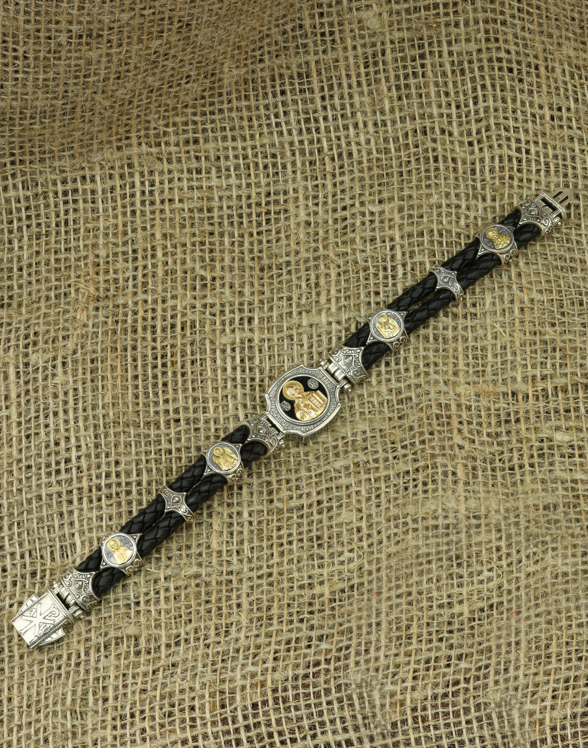 Браслет из серебра и золота c кожаным шнурком и ониксом