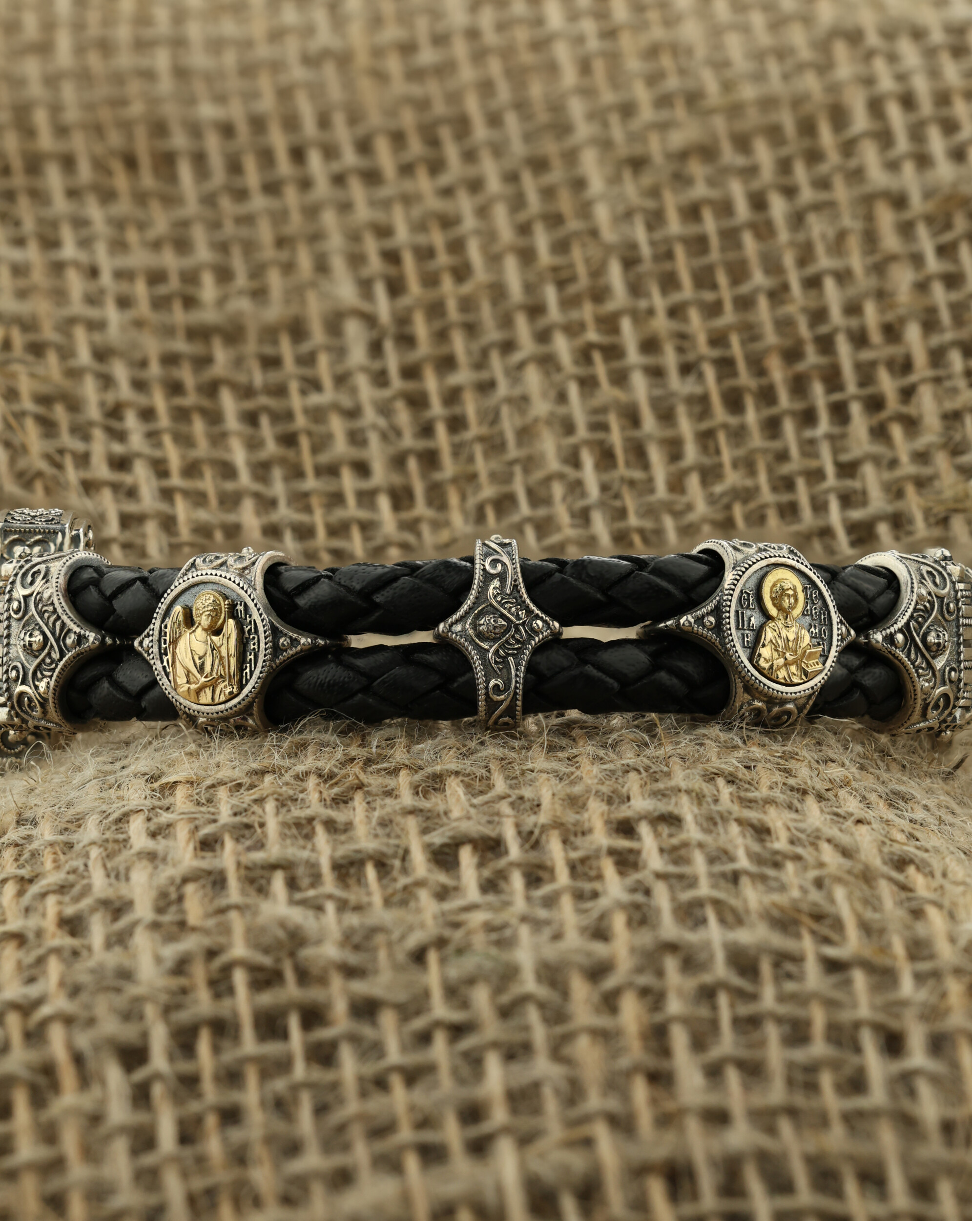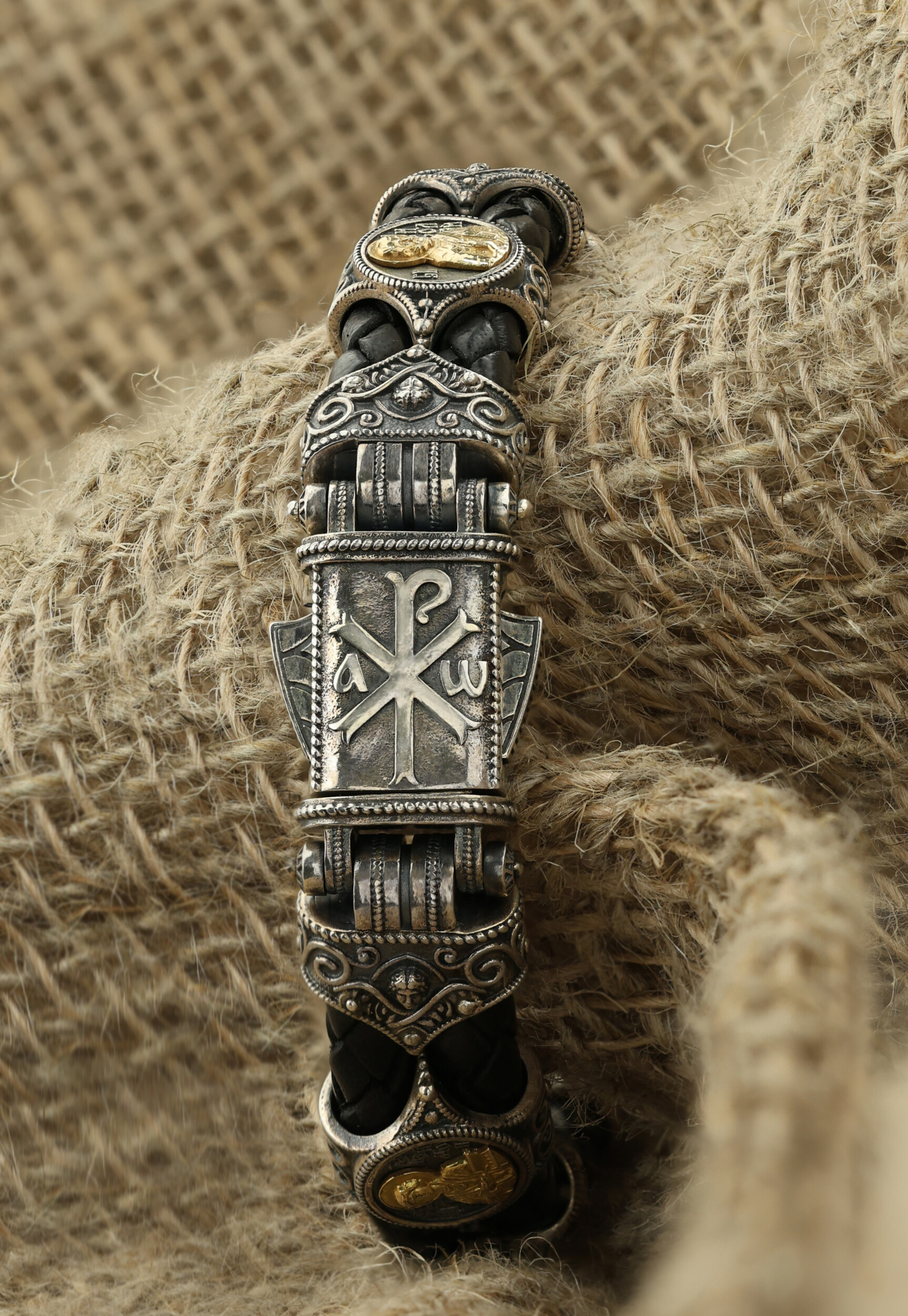Браслет из серебра и золота c кожаным шнурком