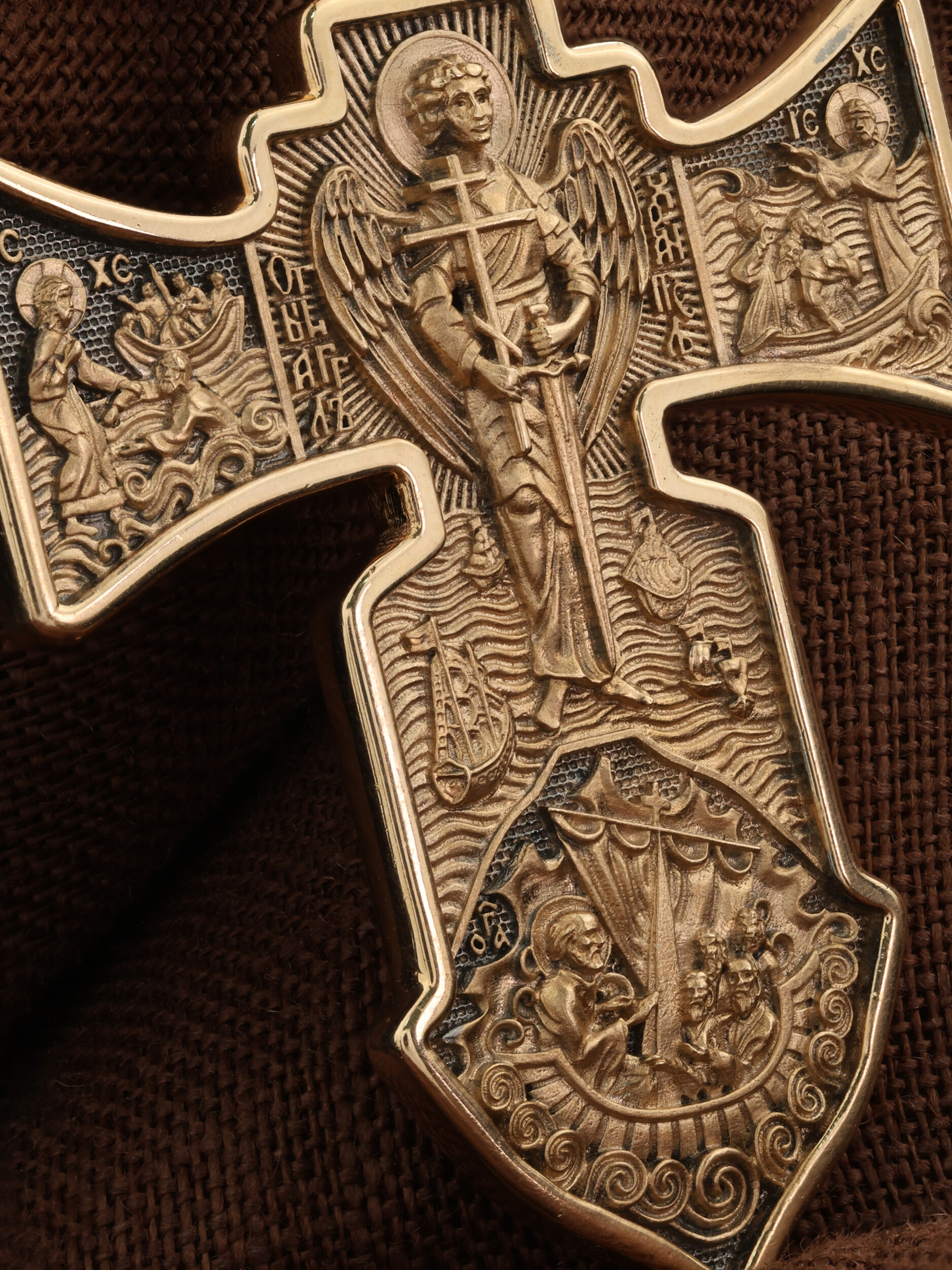 Оборот Морского креста весь посвящен охранению и спасению путешествующих по морю. В центре — могучая фигура Ангела Хранителя с крестом и мечом. Он стоит на волнах. Это образ Ангела Хранителя, стража душ человеческих как на море, так и в буре житейских страстей и искушений.