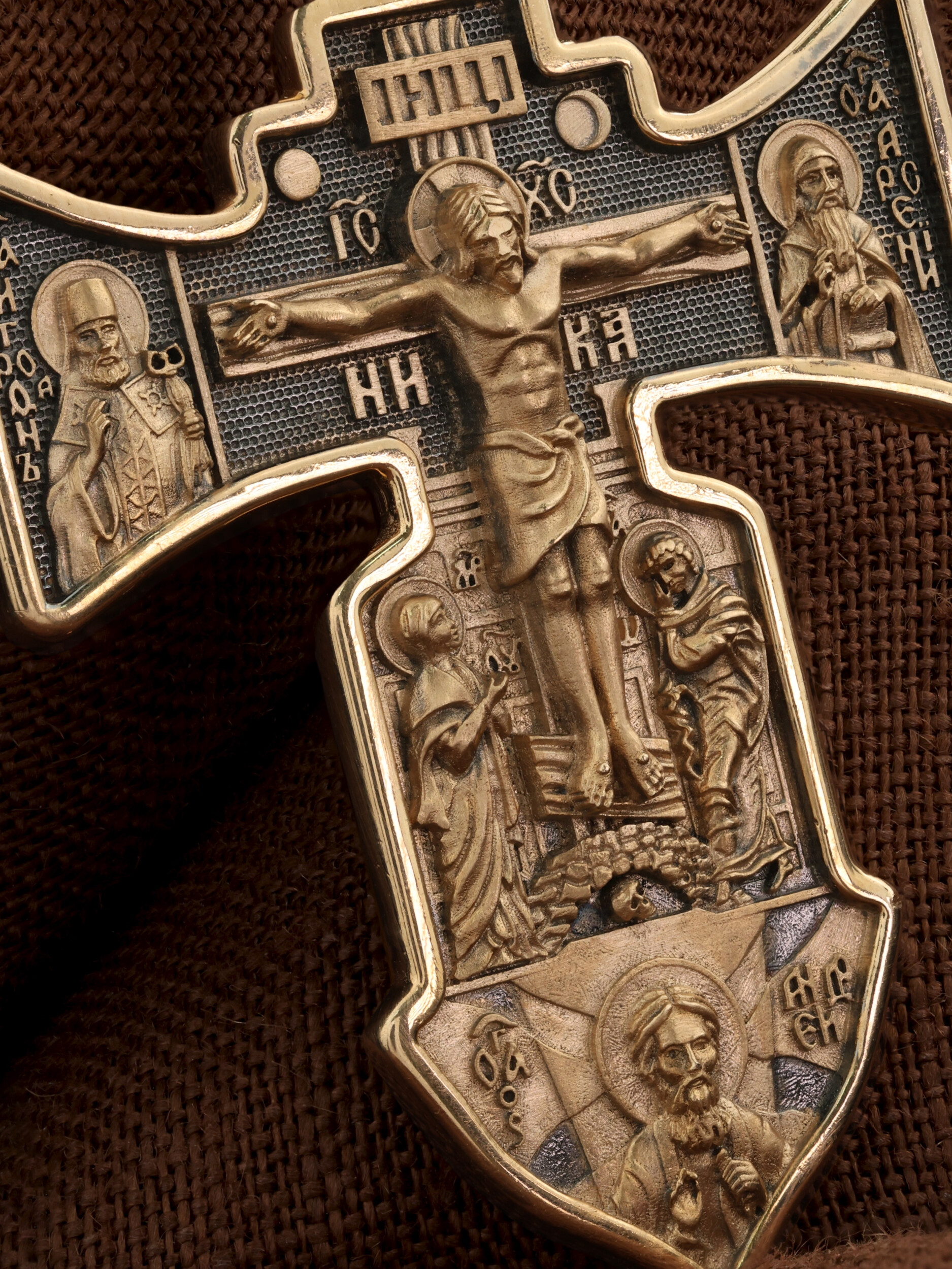 На лицевой стороне креста изображено Распятие Господа Иисуса Христа.