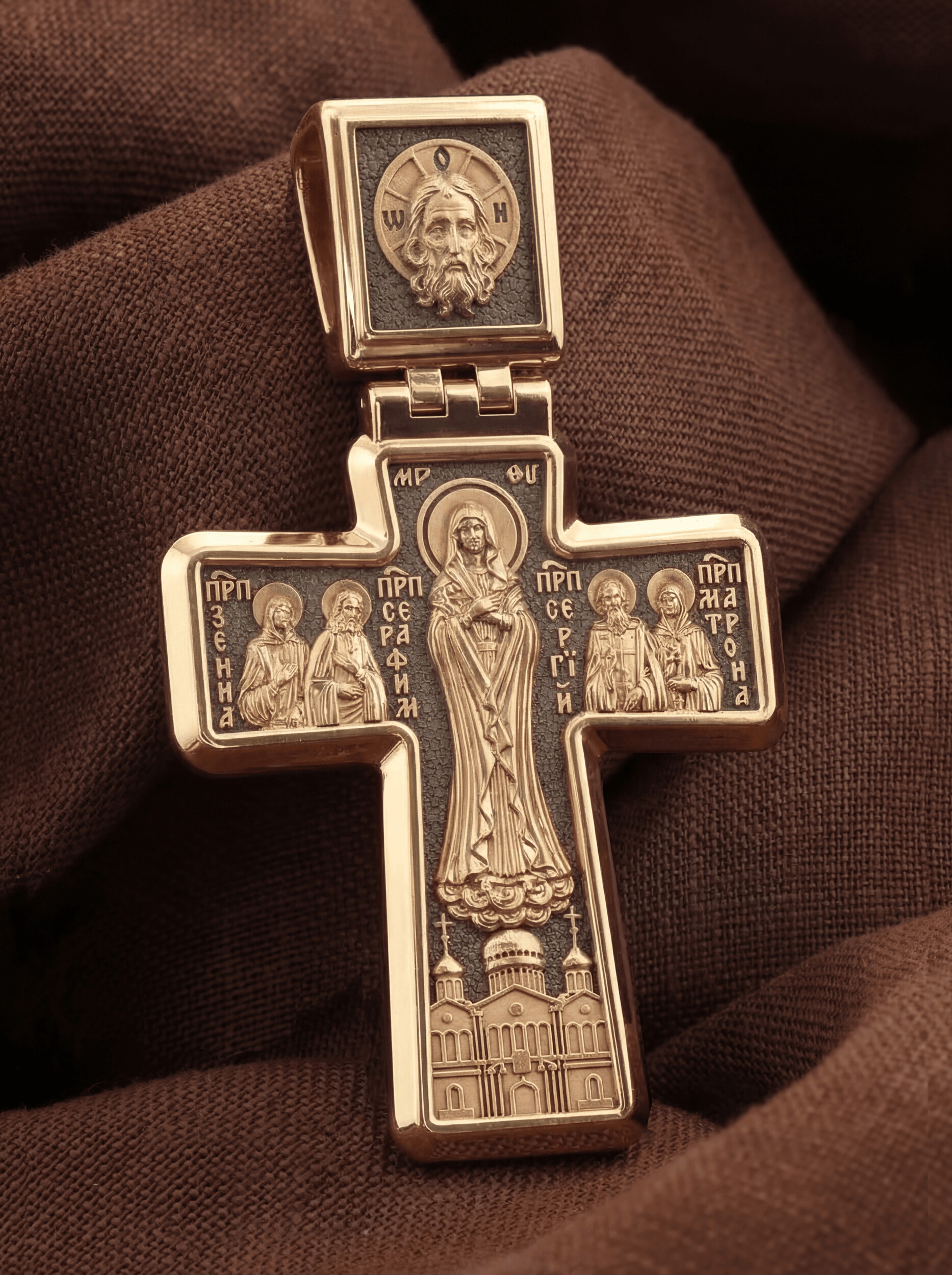 На лицевой стороне креста изображено Распятие Иисуса Христа. Позади Его изображена иерусалимская стена, знак того, что Господь был распят вне стен города. Но вместе с тем стена знаменует и Небесный Иерусалим, путь в который открылся для человечества через Голгофу: «МЛРБ», «Место Лобное Рай Бысть» — написано у ее основания. Рядом с Его образом помещены слова «Царь Славы». Эти слова характеризуют Господа как Великого Архиерея, победителя смерти. Верхняя перекладина символизирует титло — табличку, на которой, согласно Евангелию, было начертано: «Иисус Назорей Царь Иудейский» (IНЦI). Также Распятие сопровождается надписями, олицетворяющими Христа. Это святое имя Христа «IC» (Иисус) «ХС» (Христос), и словосочетание «Сын Божий», а так же написан тропарь Животворящему Кресту: «Кресту Твоему поклоняемся, Владыко, и святое воскресение Твое славим». Распятие стоит на горе камней, символизирующих Голгофу, в основании которой различается череп. Это голова Адама. На кулонном кольце помещено изображение Святой Троицы.