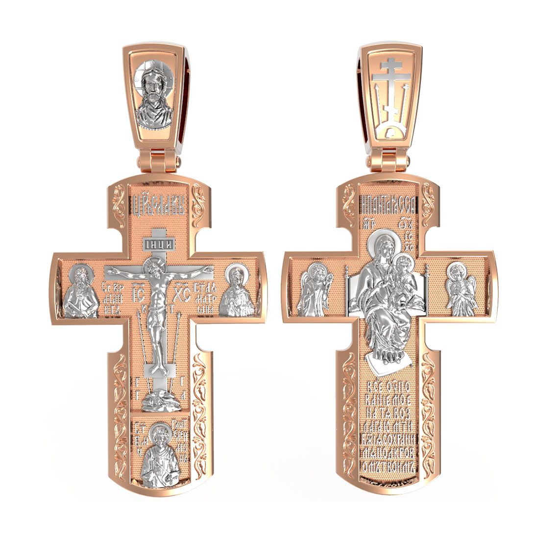 Внизу креста написана молитва обращенная к Божией Матери «Все упование мое на Тя возлагаю, Мати Божия, сохрани мя под кровом Твоим».