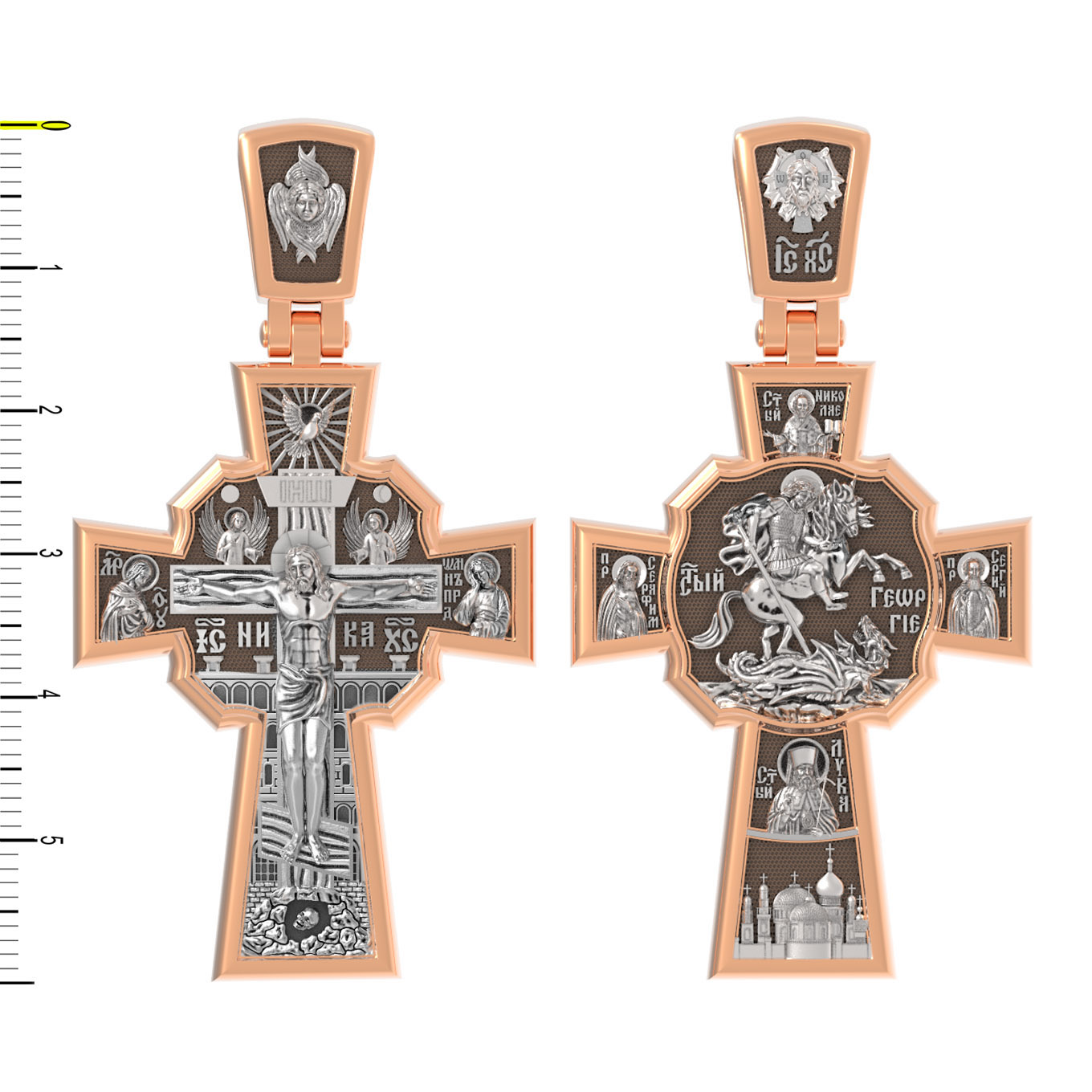 В центре оборотной стороне креста помещен образ Святого Великомученика Георгия Победоносца — одного из самых почитаемых и удивительных святых. На образке он изображен как воитель поражающий копьем огнедышащего змея. Змей символизирует собою сатанинские силы. Справа помещен образ Святого Преподобного Сергия, игумена Радонежского, чудотворца, слева — Преподобного Серафима Саровского, чудотвореца. Выше помещен образ Святителя Николая архиепископа Мир Ликийских, чудотвореца, ниже — образ святителя Луки (Войно-Ясенецкого), архиепископа Симферопольского и Крымского, исповедника и изображение Храма. На кулонном кольце изображен Спас Нерукотворный — образ Господа и Спасителя нашего Иисуса Христа, чудесно отпечатавшийся на плате, котором Христос вытер свой лик.